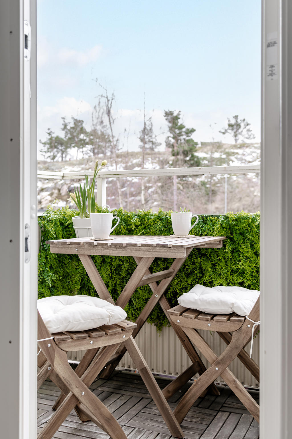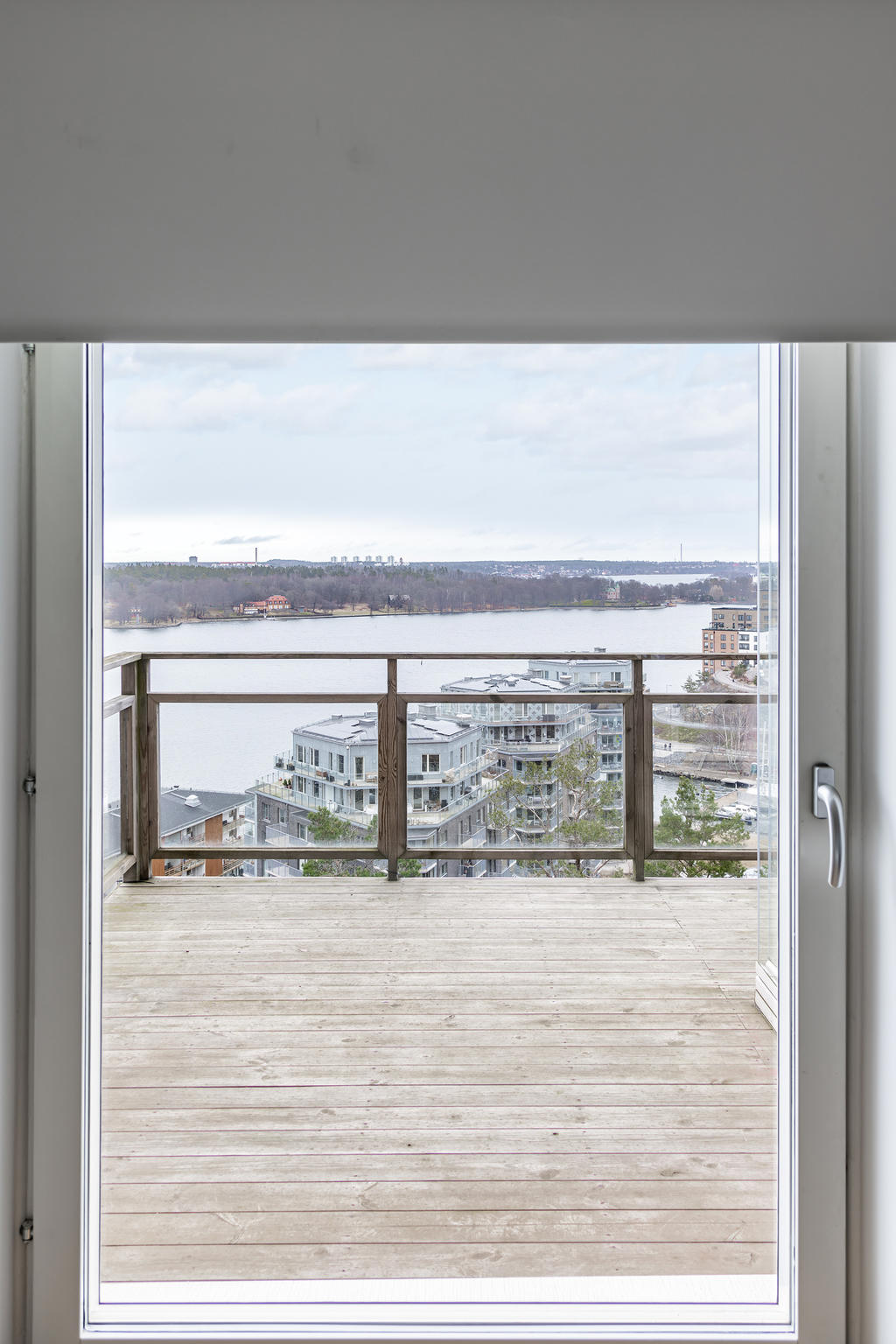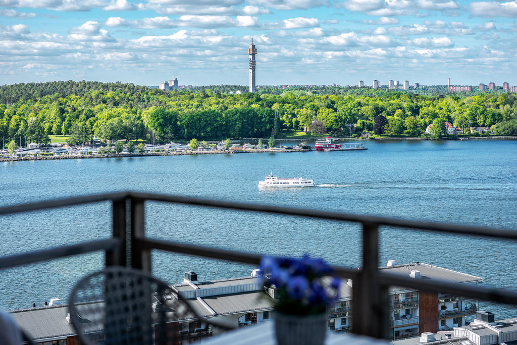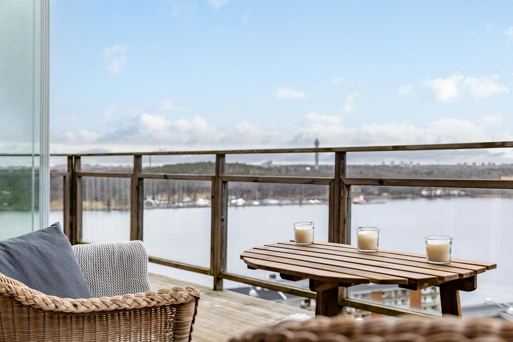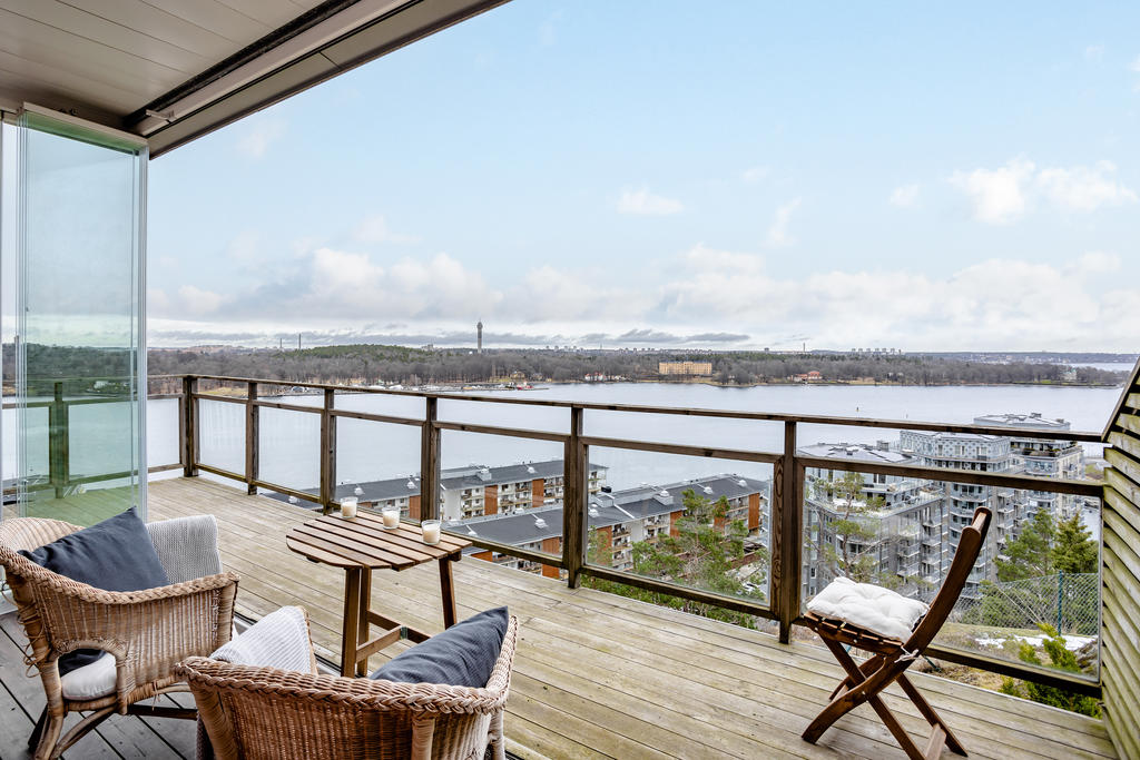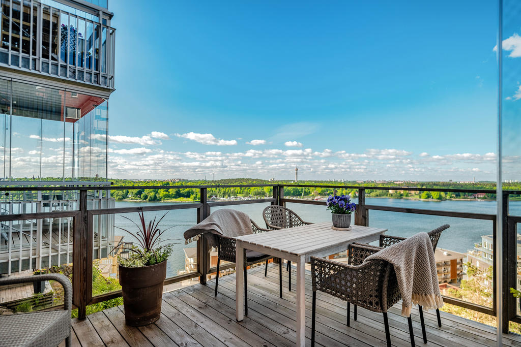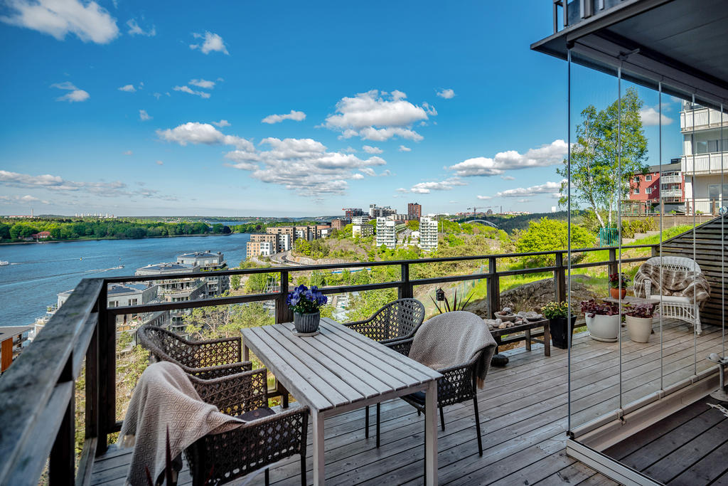 Från vardagsrum och terrassen njuter man av fantastiskt skådespeleri, dag som natt året om. På kvällarna passerar stora kryssningsfartyg som lyser upp och på dagarna njuter man av det glittrande vattnet. På sommaren fylls himlen av luftballonger och sången från Allsång på Skansen hörs på håll. Terrassen är även delvis inglasad vilket förlänger dess säsong ytterligare. Den inglasade delen går även att öppna upp helt de varma sommardagarna. Här finns ordentligt med plats för både loungedel och stor matgrupp för tillställningar och familjemiddagar.