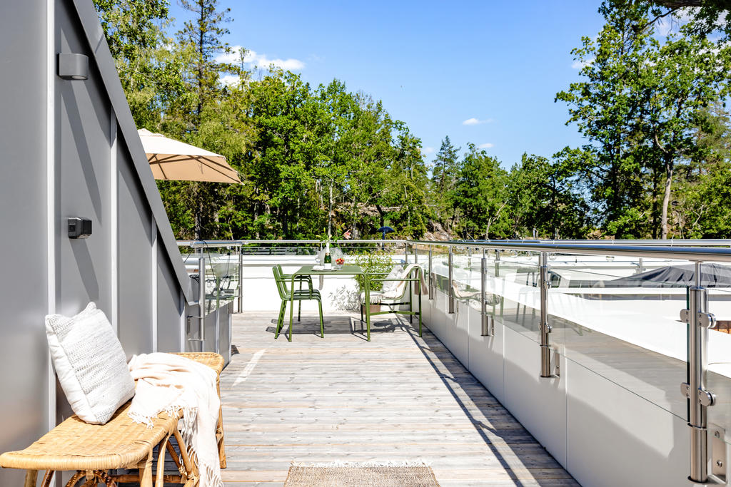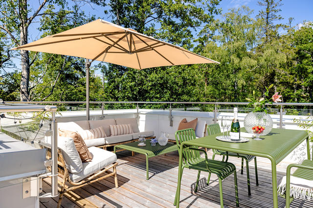 Högst upp finner husets diamant, takterrassen! Här njuter man i lugn och ro av ett soligt och fridfullt läge. Takterrassen är väl tilltagen och här njuter man av sol hela dagen. Man skymtar dessutom Stockholms inlopp vilket inte är fy skam!