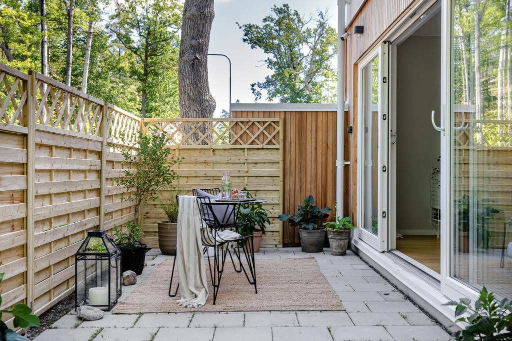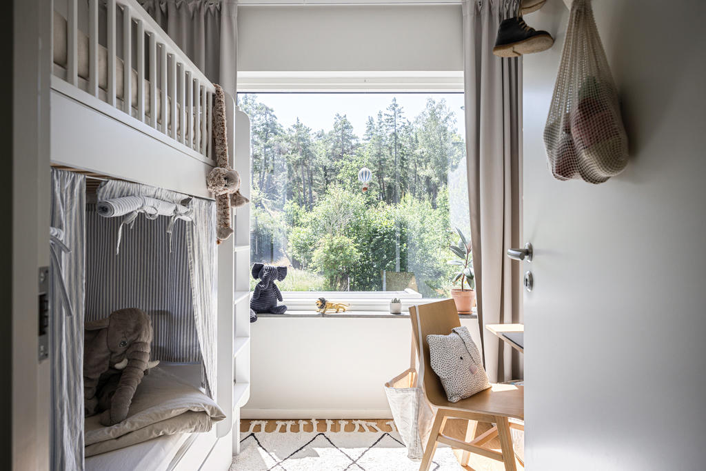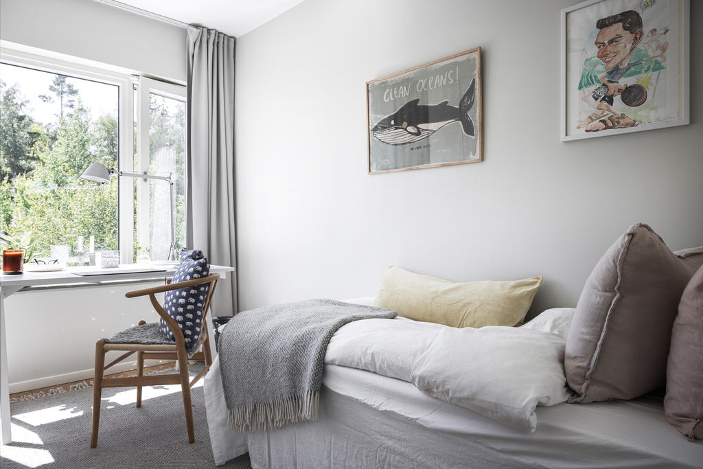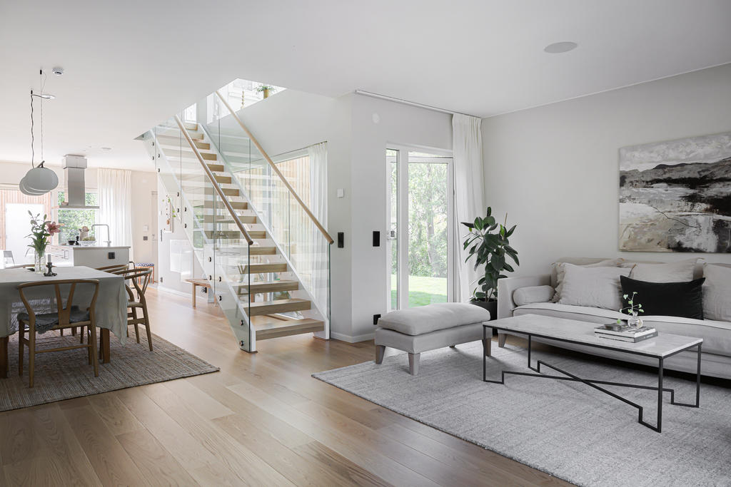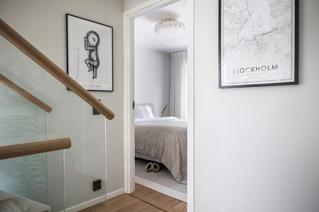 Huset består av totalt 5 rum och två badrum fördelat på två plan. På entréplan finner man ett luftigt och väl tilltaget vardagsrum som flyter ihop med köket och bildar en social mittpunkt. Från vardagsrummet når man totalt två uteplatser, den ena på baksidan samt en på gaveln. Köket är påkostat med exklusiva och sobra materialval som exempelvis bänkskiva och stänkskydd i snygg och ljus sten. Den trevliga köksön skapar ännu mer arbetsyta. Från köket når man enkelt en stenlagd uteplats där man med fördel kan avnjuta frukost och lunch tack vare det trevliga solläget. En trappa upp finner man samtliga sovrummen, ett mindre allrum samt ett väl tilltaget badrum utrustat med badkar. Bägge badrummen är även de påkostade med exklusiva materialval som exempelvis Norrvange kakel och klinker från Bricmate.