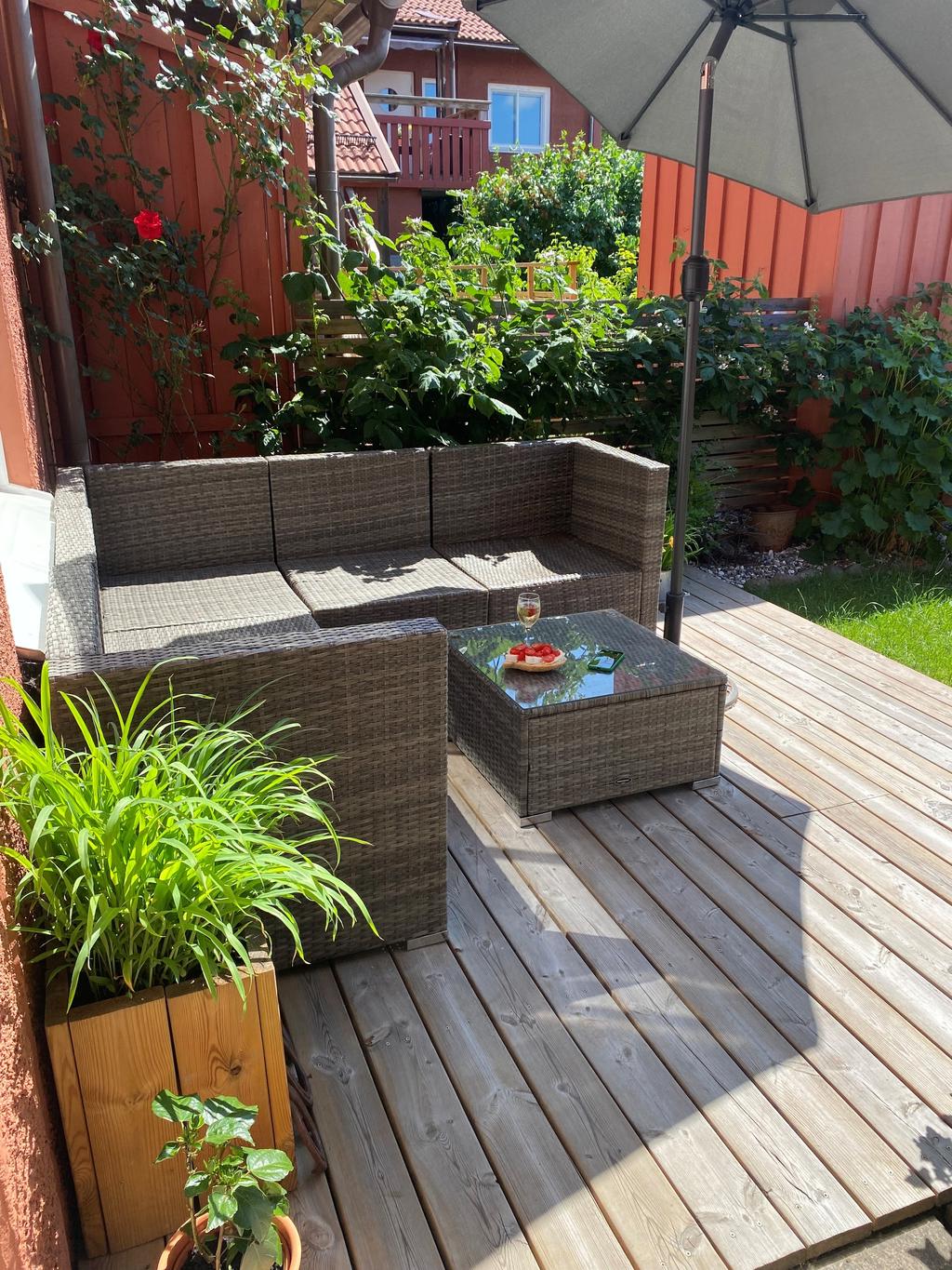 Trädäcket på framsidan har jag byggt själv år 2022.