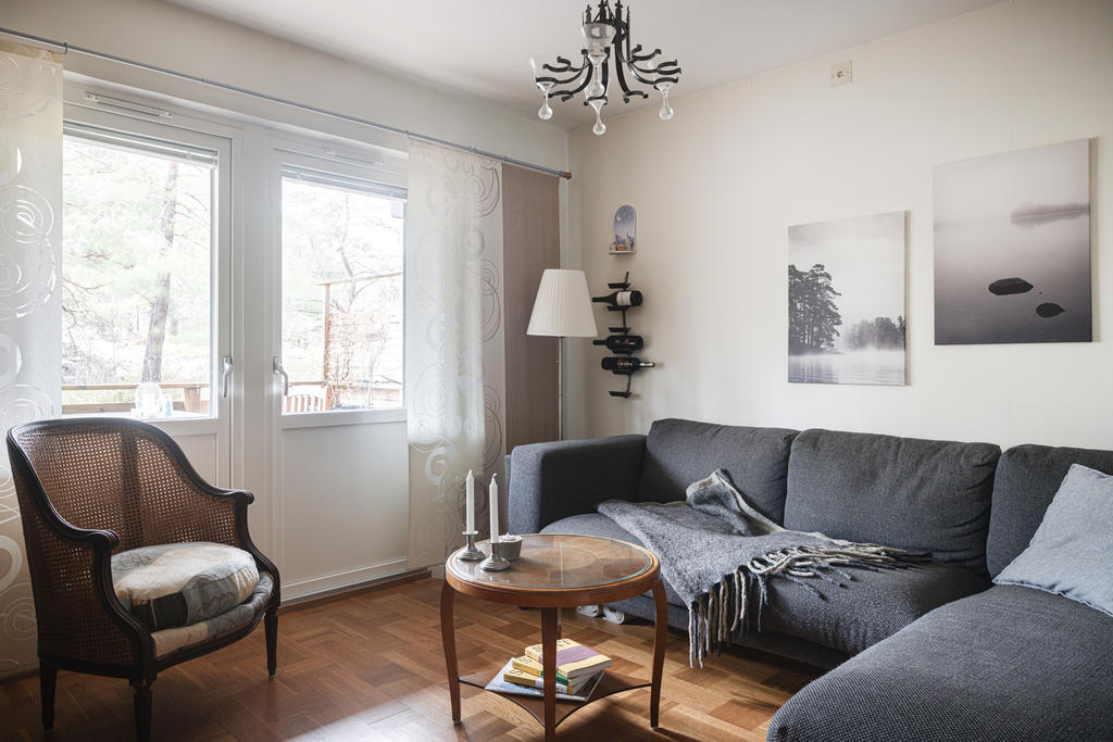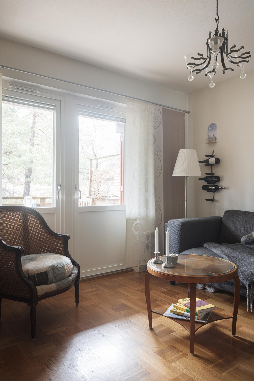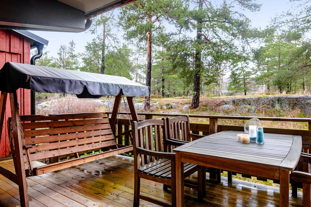 Säljarens egna ord: Jag älskar mina båda uteplatser! Frukost i morgonsol på altanen, fika och njuta av solen på framsidans trädäck i sköna loungemöbler - här krävs ett parasoll soliga somrar - det blir varmt då solen ligger på hela dagen. Middagen intas på altanen i skön skugga. Där trädäcket tar slut tar en liten gräsplätt vid och grillen är placerad på nedgrävda stenplattor. Läget och området har varit fantastiskt för mig - verkligen en perfekt plats för mina barn att växa upp på. Bodde tidigare i hus på Värmdö så detta blev toppen, fortfarande med närhet till naturen men också lätt att ta sig in till stan. Med en tonåring som skulle in till gymnasiet och en liten som jag ville ha bra förskola till. Nu flyttar snart min yngsta hemifrån och jag känner att jag vill prova ett annat boende. Jag kommer sakna detta oerhört, men väljer att se tillbaka på alla mina år här med glädje. Min tomtplätt blir nästan en sorg att lämna, men hoppas verkligen nästa ägare ska njuta av mina enorma björnbär, murgrönan som klättrar uppför spjälstaketet och alla stockrosor! Jag har bott här sedan 2007 med mina två barn. Stor åldersskillnad, vilket gjorde att jag skapade ett till sovrum och sedan hade jag bäddsoffa i vardagsrummet. Äldsta flyttade ut och vi gjorde en liten rockad, d.v.s. bäddsoffan byttes ut. Härligt ljusinsläpp, genomtänkt planlösning som gör att jag aldrig upplevt insyn trots markplan. Gott om förvaringsutrymmen. Stort badrum med badkar och tvättmaskin. Även när jag ställer upp torkställningen upplevs det inte som trångt."