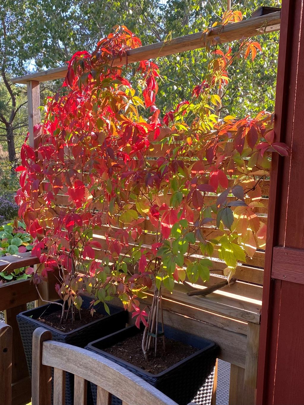 Spjälstaket som avgränsar mot gården byggde jag själv år 2023.