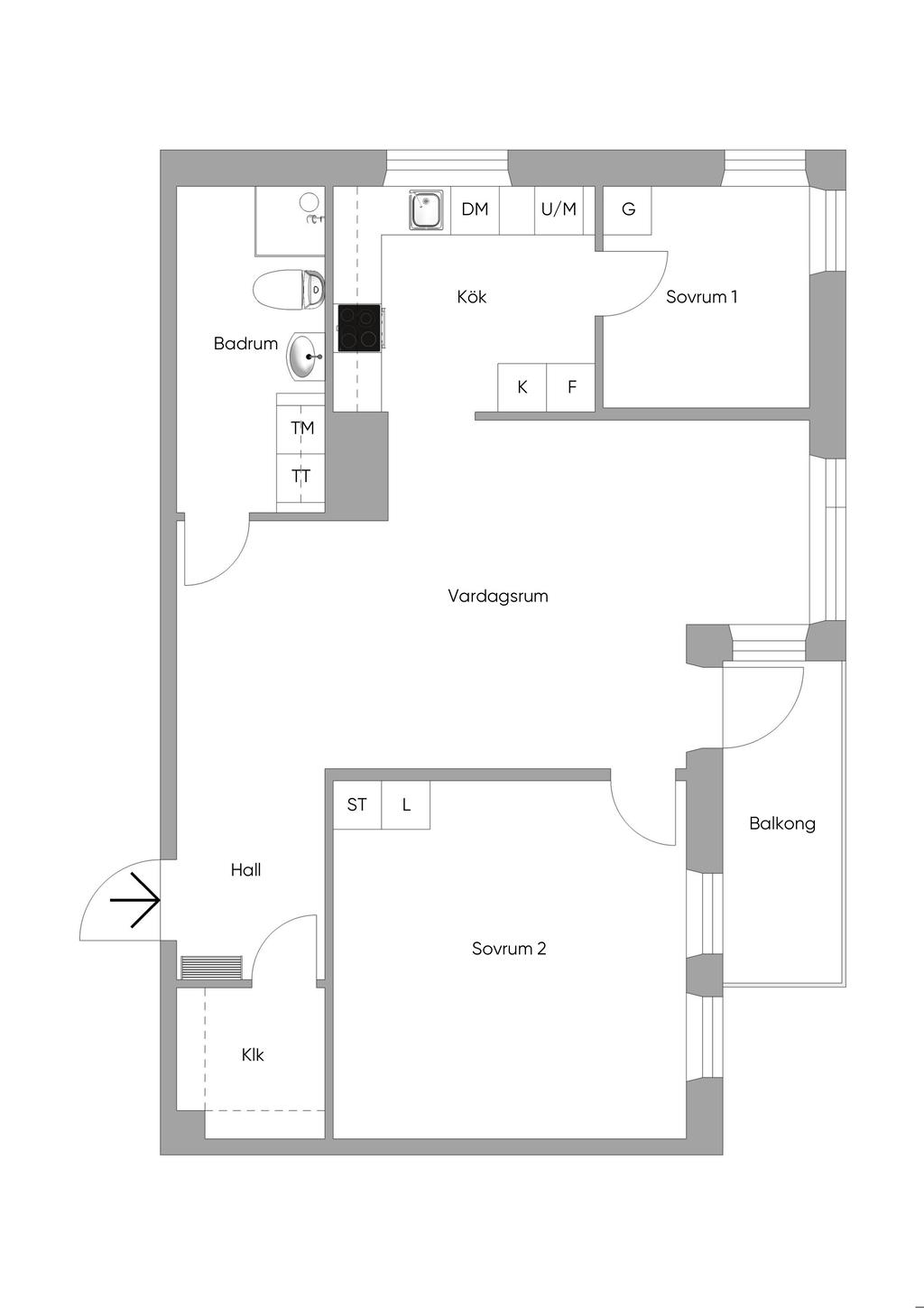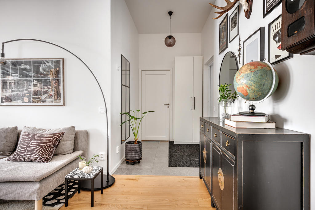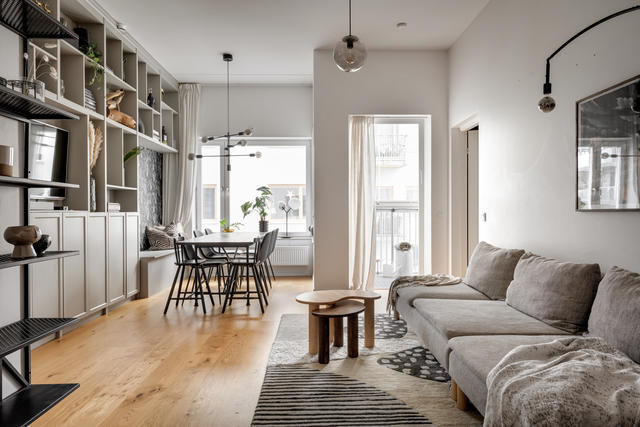 Säljarens egna ord: ” När man först kommer in slås man av den höga takhöjden och rymden den ger. Alla reagerar på den maffiga takhöjden! Hela 3,10m gör lägenheten lite kaxig och den upplevs mycket större och luftigare. Den platsbyggda hyllan delar av vardagsrummet fint med förvaring. Den inglasade balkongen används flitigt under hela året och blir ett extra rum. Det blir aldrig för varmt i lägenheten, något många av våra grannar klagat på om sommaren. Vår lägenhet har härlig morgonsol som precis försvinner runt knuten mitt på dagen då det blir som varmast, men som sen kommer tillbaka runt andra hörnet i lägenheten på kvällen. Lägenheten upplevs alltid ljus. Det stora sovrummet känns lyxigt och har gott om plats om man skulle vilja dela av det till två rum. Toaletten känns fräsch och stor, extra lyxig med terrazzoskivan istället för den tidigare laminaten.