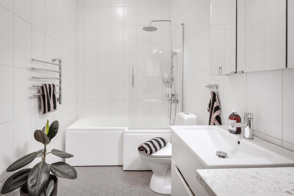 Med den stora takhöjden så blir badrummet luftigt och stort. Här har du allt som behövs: WC, badkar med duschvägg, kommod samt tvättmaskin och torktumlare. Skåp för förvaring och en bänkskiva i terrazzo.