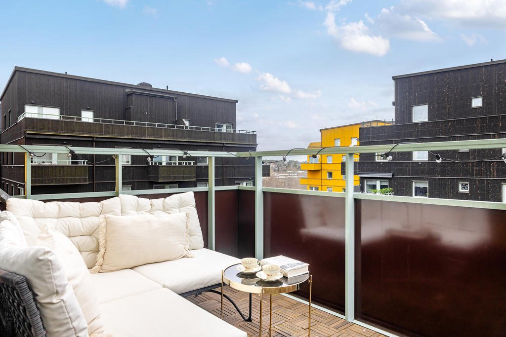 Ljus trea högt upp i huset med balkong och garage i huset!