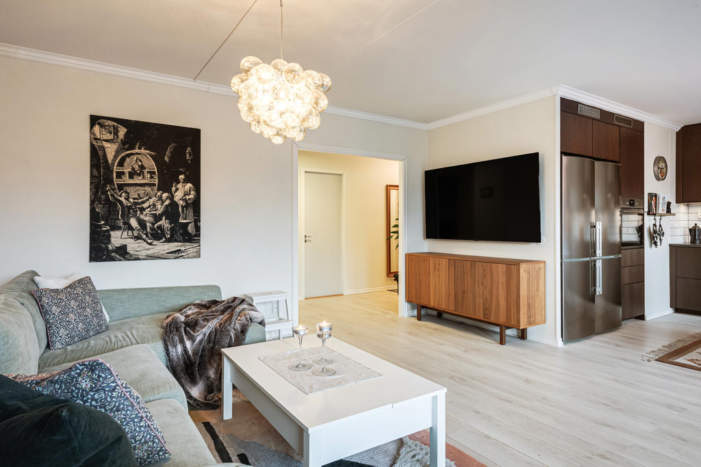 Äntligen en topprenoverad lägenhet i en av de populära tågvagnarna. Lägenheten är registrerad som fyra rok, disponeras idag som en stor trerummare. Ljus och luftig lägenhet om hela 91 kvm. Bostaden präglas av den öppna och moderna planlösningen. Köket är renoverat i bästa stil, både arbetsvänligt och med gott om förvaring. En ordentlig matplats som rymmer hela familjen med gäster. Vardagsrummet och den stora balkongen med utsikt över den barnvänliga innergården knyter samman bostaden med den inre hallen och bostadens övriga rum. Ett masterbedroom med inbyggd förvaring ligger fint och avskilt längst in i bostaden. Ett större sovrum med plats för två sängar kan enkelt delas av till två sovrum för den som önskar återställa lägenheten till en fyrarummare. Två helkaklade badrum, ett med dusch och det andra med badkar. I denna lägenhet får alla plats. Klädkammare för bra förvaring och hall med goda avhängningsmöjligheter.