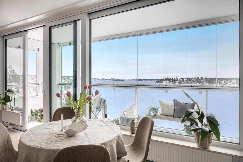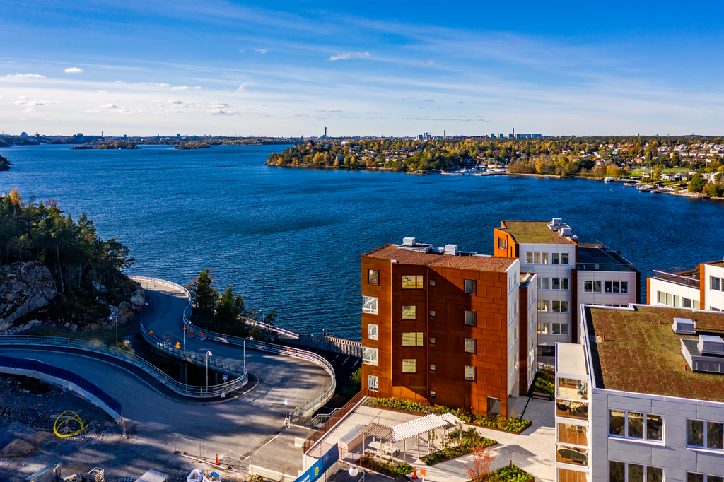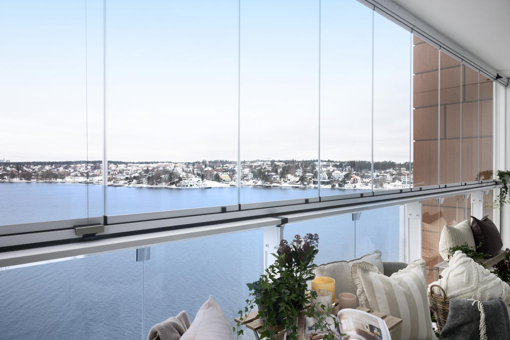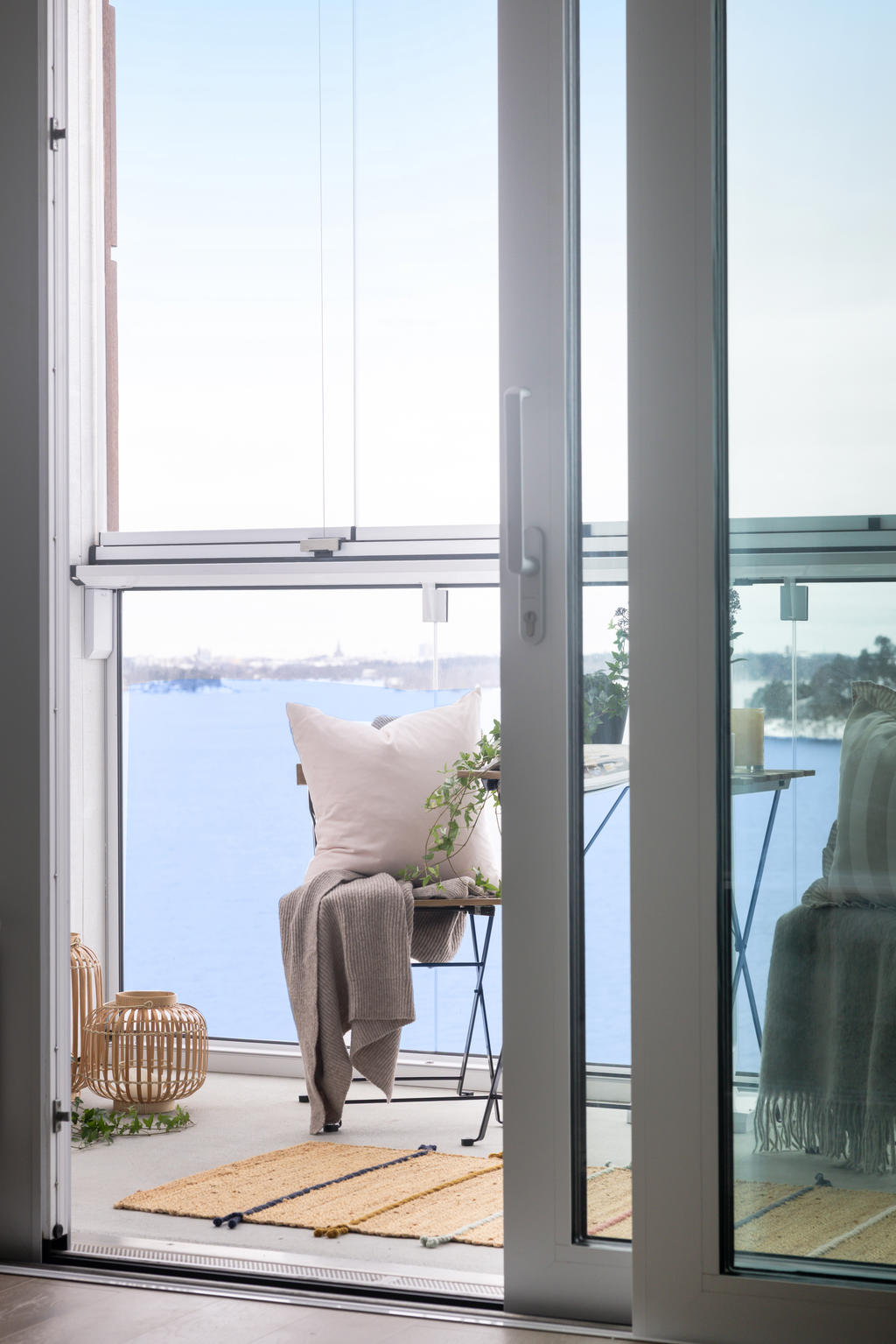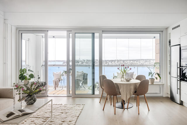 Här erbjuds en ljus och yteffektiv bostad som verkligen har det lilla extra. Balkongen om ca 14 kvm blir en naturlig förlängning av bostaden med utsikt över Stockholms inlopp.