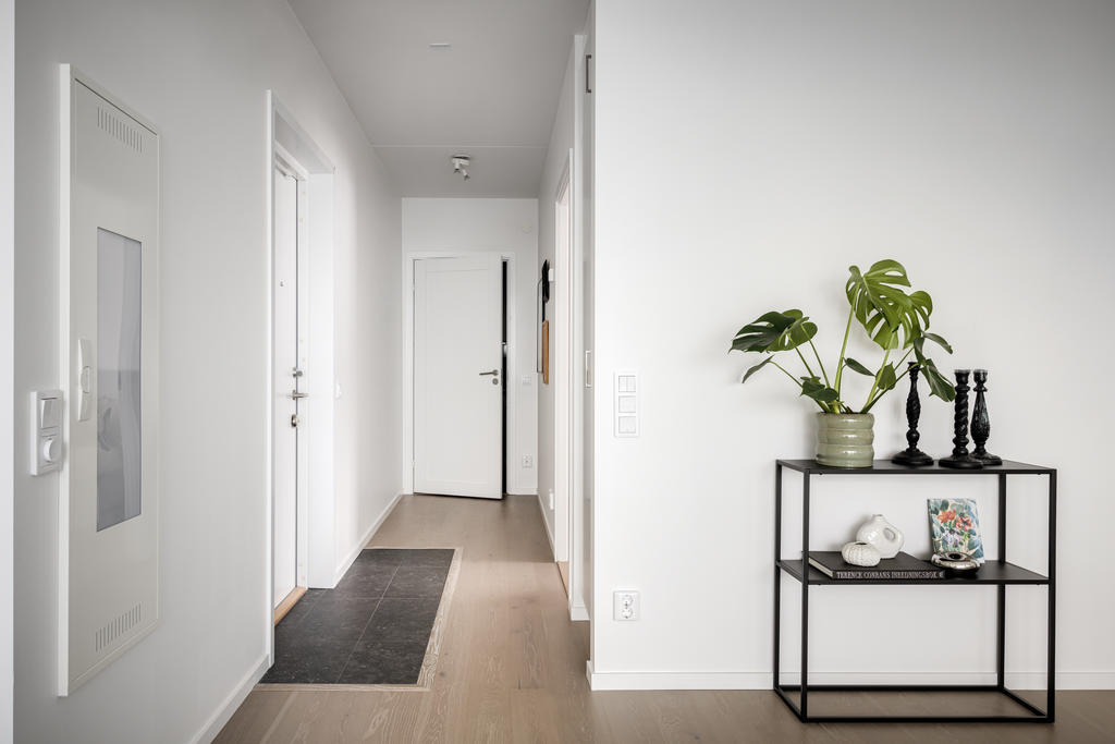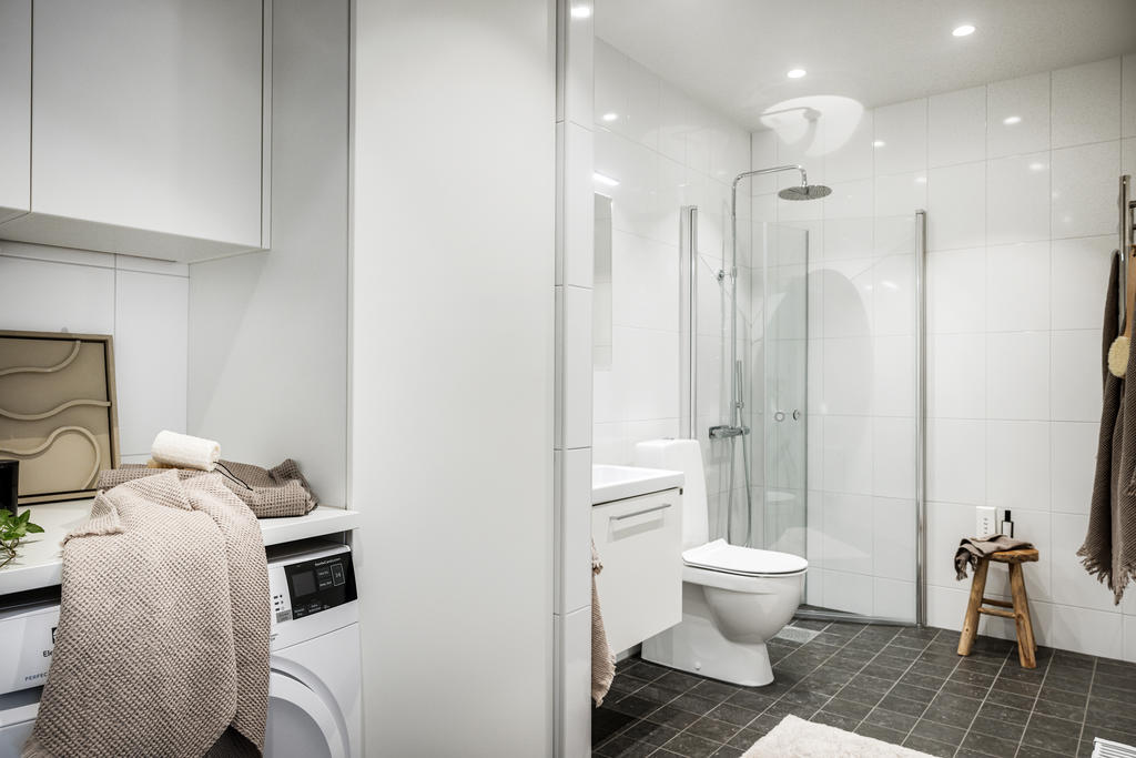 Badrummet är generöst tilltaget och uppdelat i två delar, en funktionell tvättdel med tvättmaskin, torktumlare och städskåp samt en separat del med dusch, handfat och WC. Golvvärme bidrar till extra vardagskomfort.