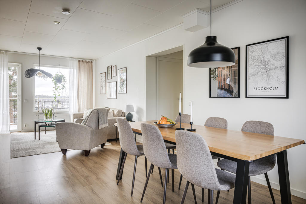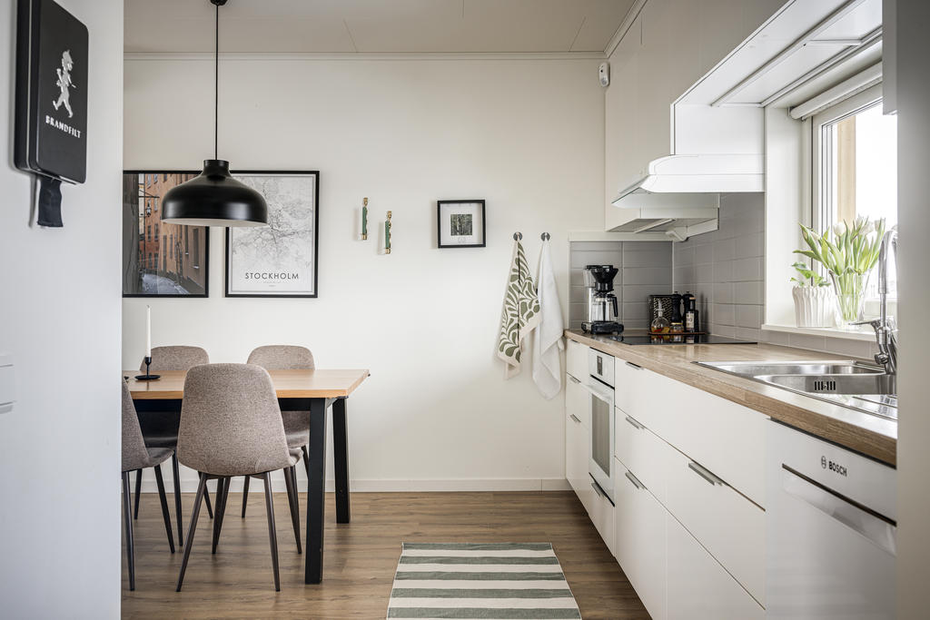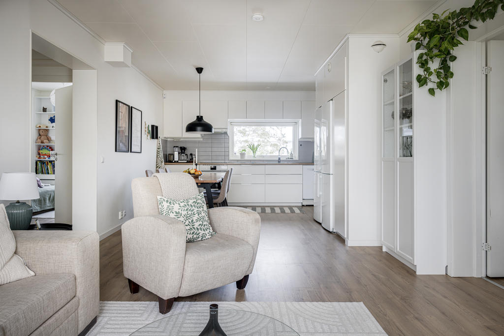 I en öppen planlösning mot vardagsrummet finns ett välplanerat kök med utrustning och förvaring för den stora familjen. Här erbjuds kyl och frys, ugn, diskmaskin samt praktisk förvaring. I vardagsrummet ges plats för en större soffgrupp, förvaringsmöjligheter och ett fantastiskt ljusflöde. Med andra ord blir det här den naturliga platsen för socialt umgänge!