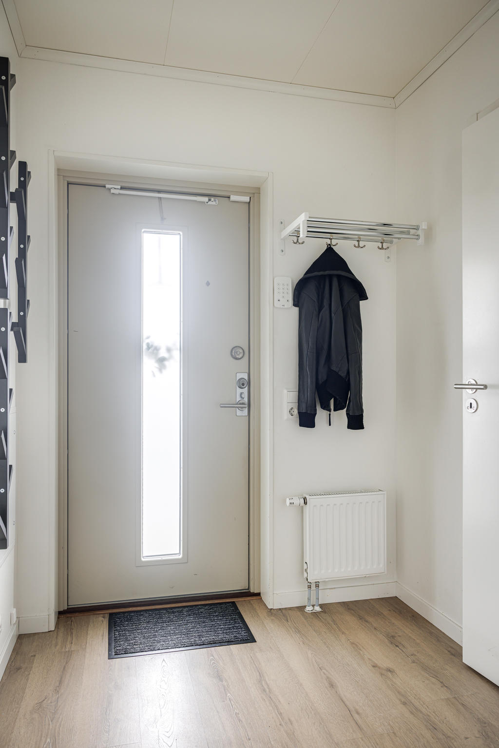 Entrén erbjuder gott om förvaringsmöjligheter med rymlig klädkammare i direkt anslutning till hallen. Lägenhetens placering i hörnet av loftgången bidrar till ett lugn då du inte får några förbipasserande grannar vid entrén eller fönster.