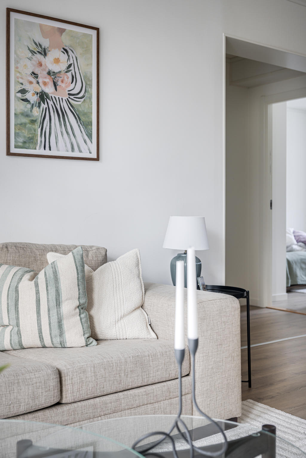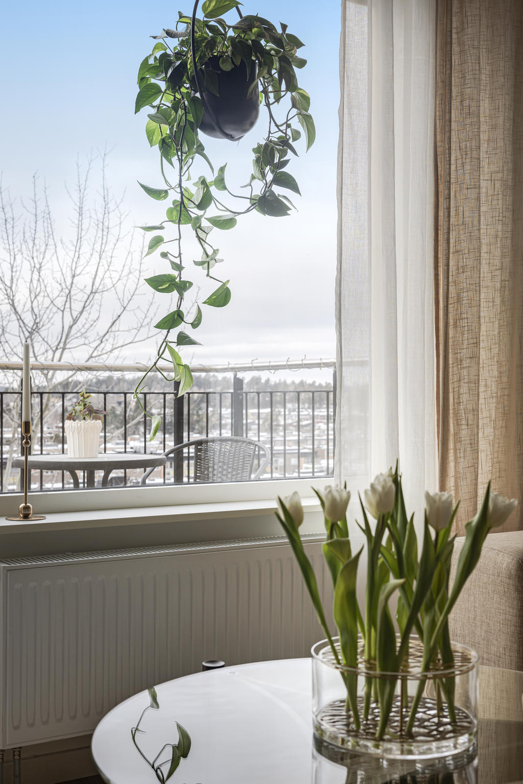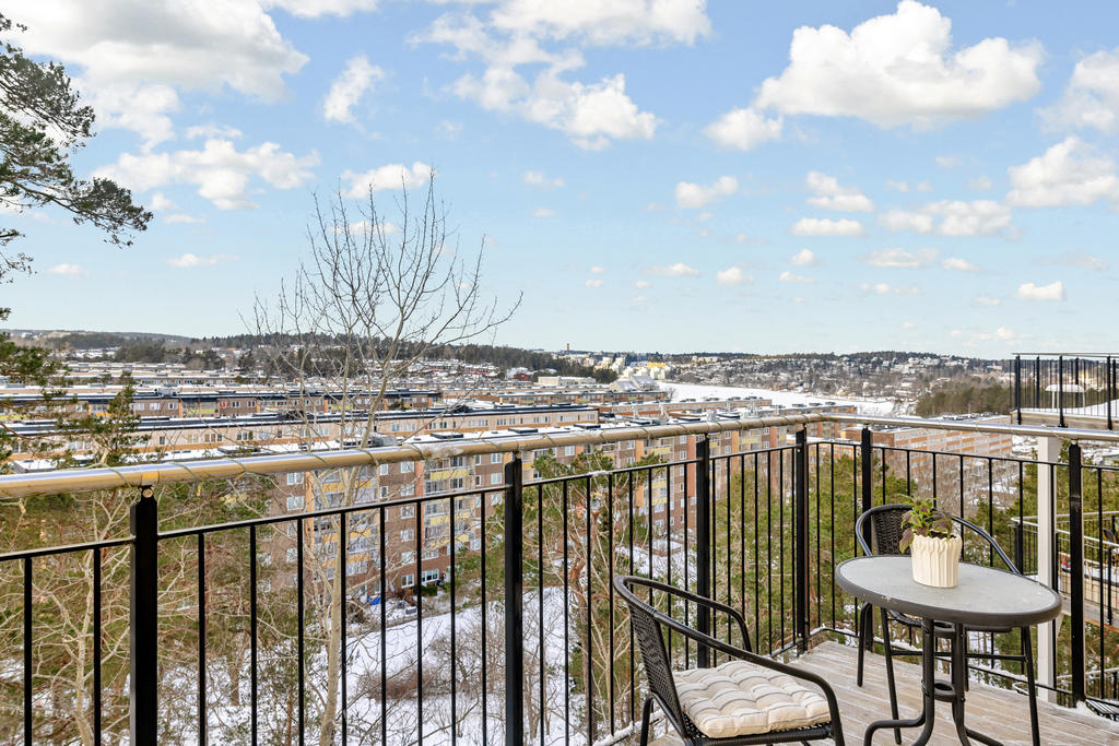 Från vardagsrummet nås den rymliga balkongen. Placerad i ett högt och fritt läge skapas ett ljus som gör den här lägenheten unik.