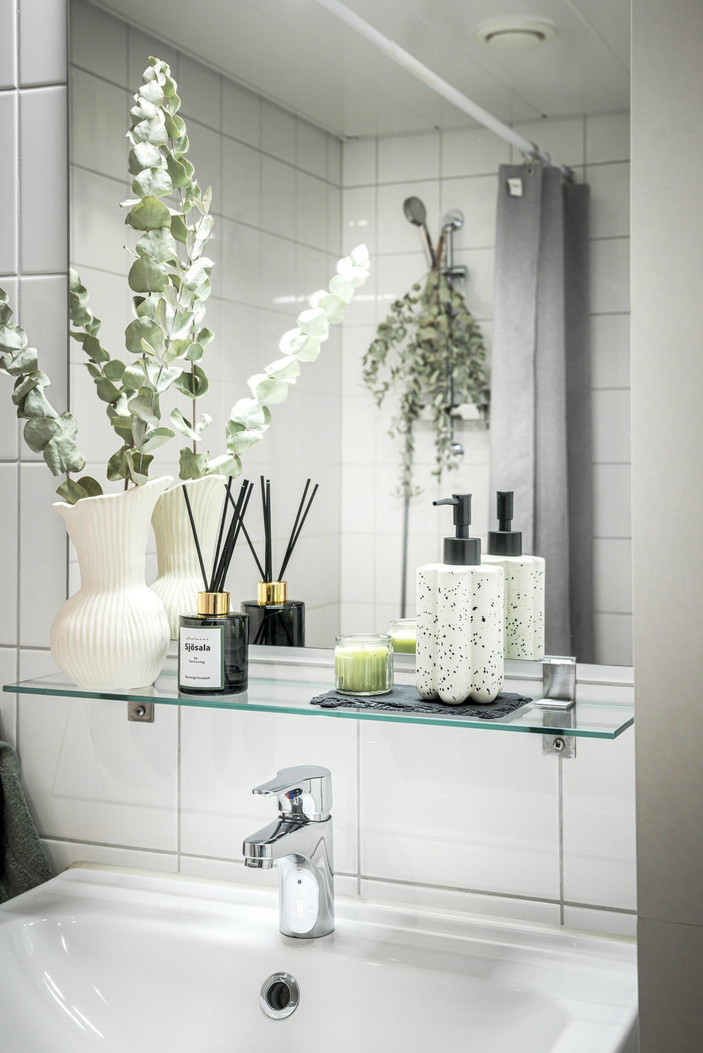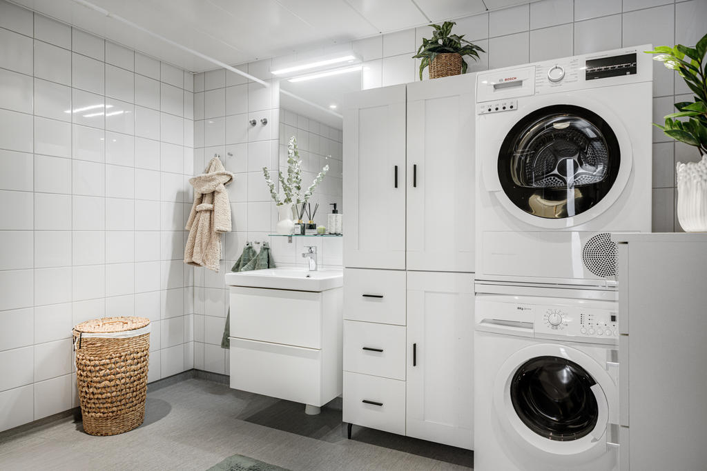 Stort och rymligt badrum utrustat med tvättmaskin, torktumlare och dusch.