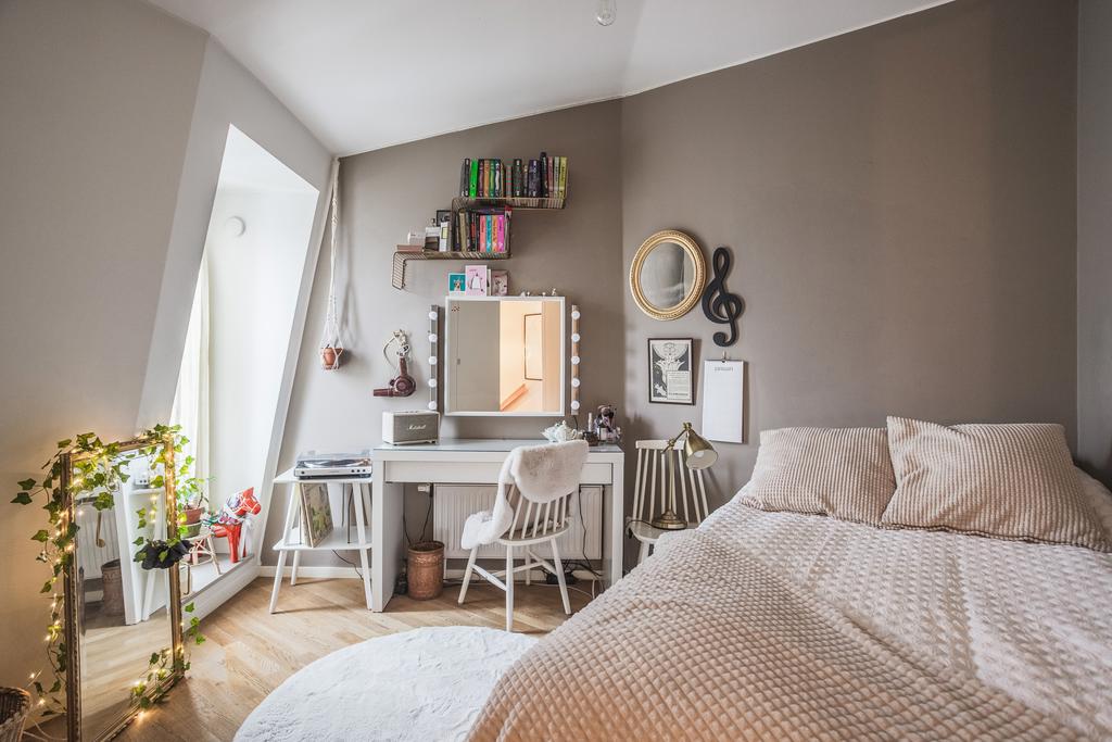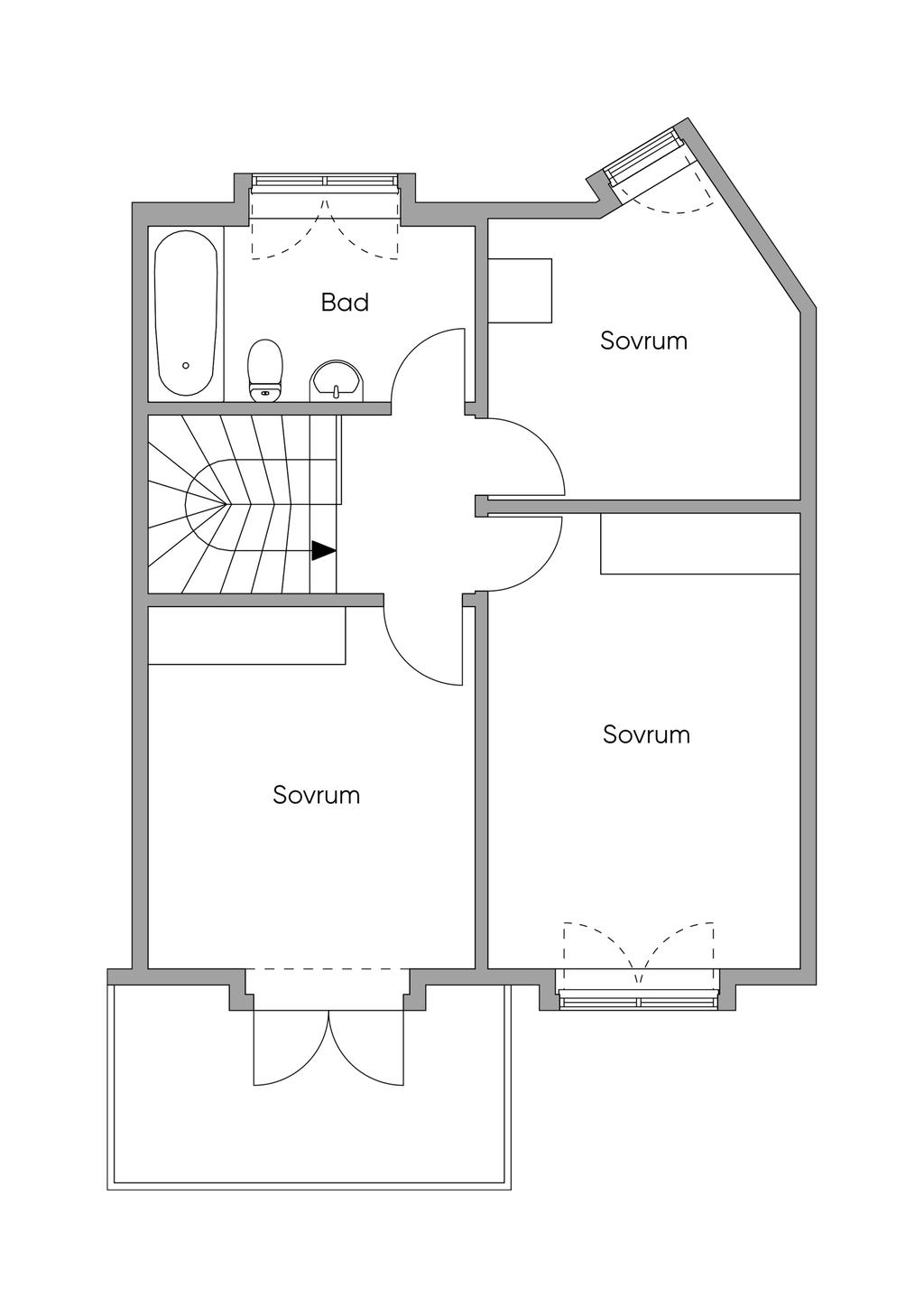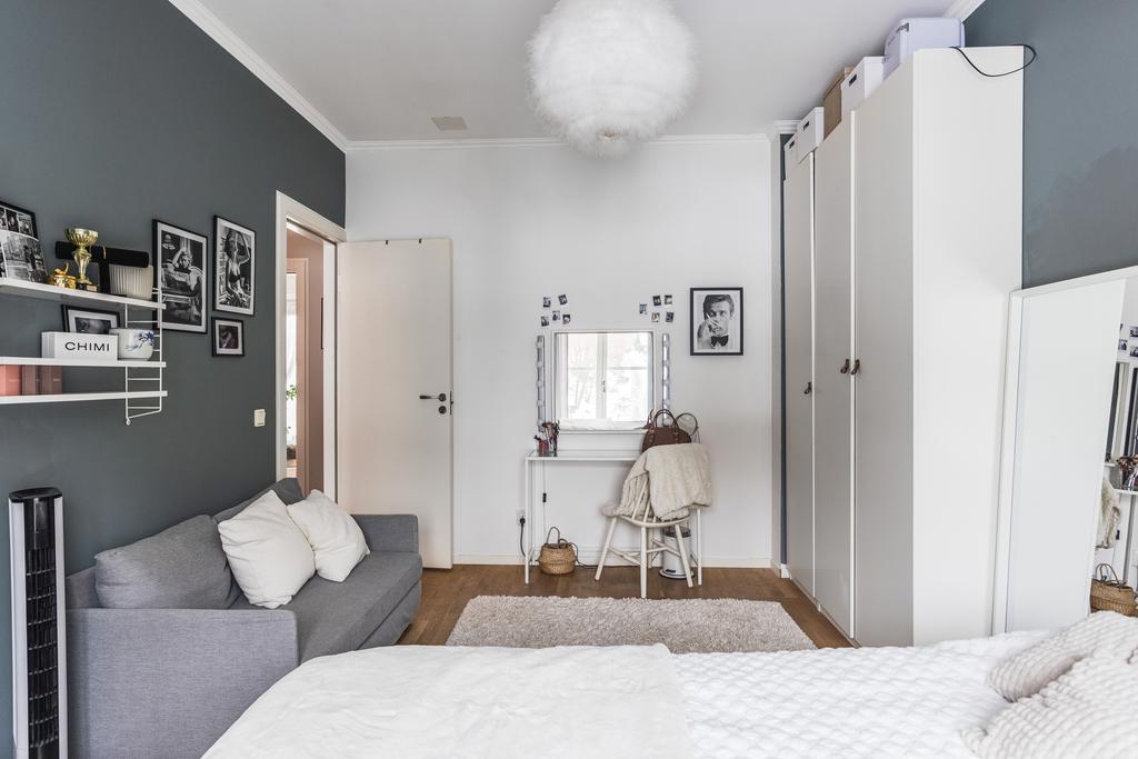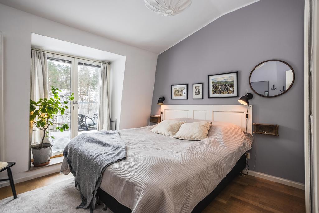 På övervåningen väntar en privat och lugn del av hemmet, där samtliga rum har parkettgolv. Här finns tre sovrum i varierande storlek. Två av dem är rymliga nog för dubbelsäng och erbjuder god förvaring, varav det ena har utgång till ännu en balkong i soligt söderläge. Det tredje sovrummet passar utmärkt som barnrum, gästrum eller arbetsrum.