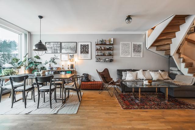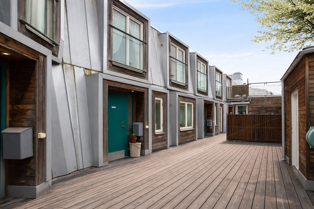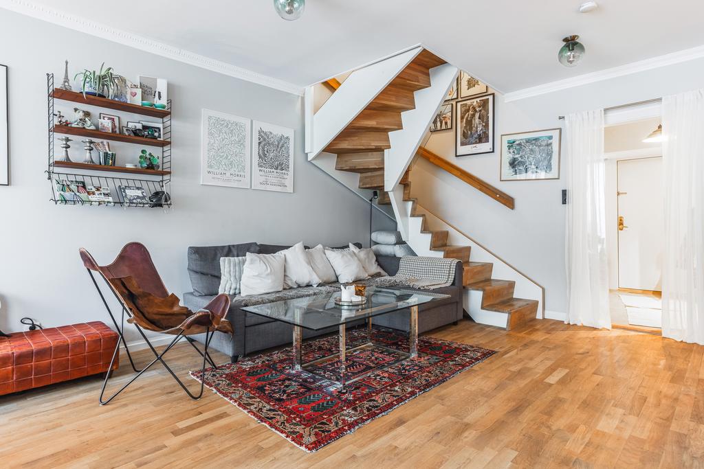 Här möts du av en välplanerad och ljus bostad i två plan där stilrena materialval, generösa ytor och flera balkonger i soligt söderläge skapar ett hem att verkligen trivas i.