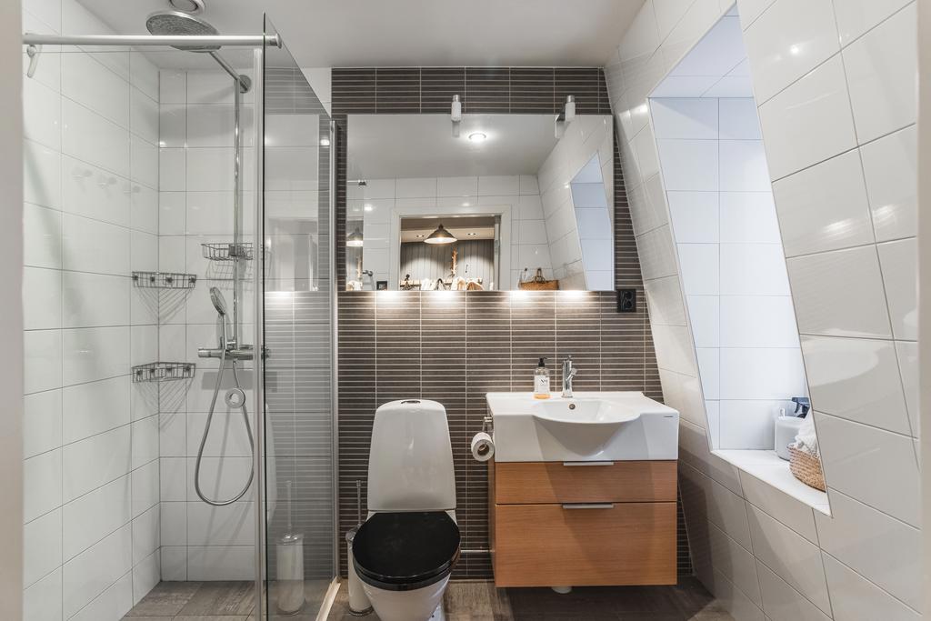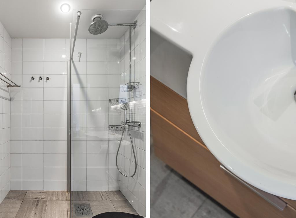 Det fräscha duschrummet på entréplan är smakfullt inrett med kakel och klinker, golvvärme och fönster som bidrar med både dagsljus och vädringsmöjlighet.