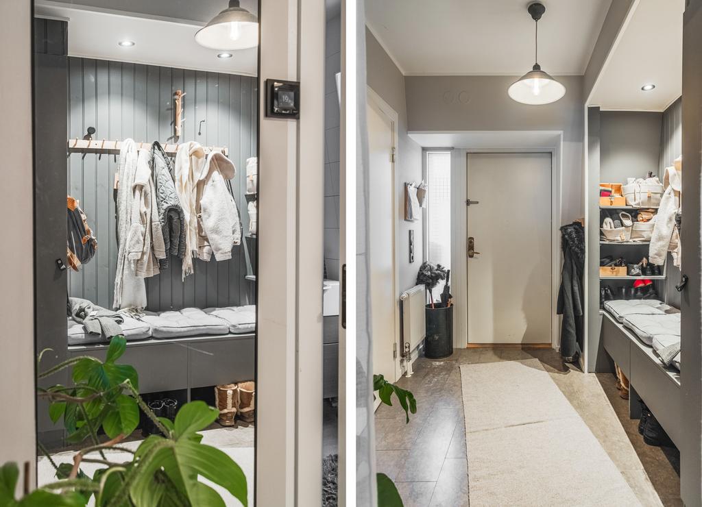 Redan i hallen välkomnas du av klinkergolv med golvvärme, bra förvaring och plats för avhängning. Siktlinjen vidare mot vardagsrummet och de stora fönsterpartierna ger ett öppet och inbjudande första intryck med ett fantastiskt ljusinsläpp.