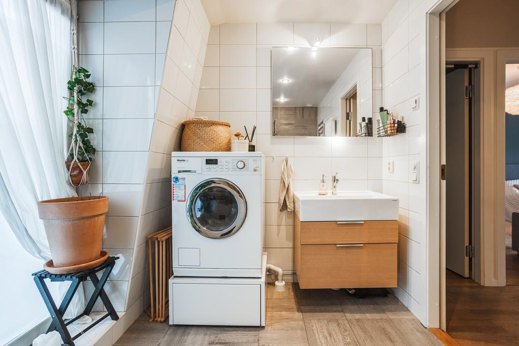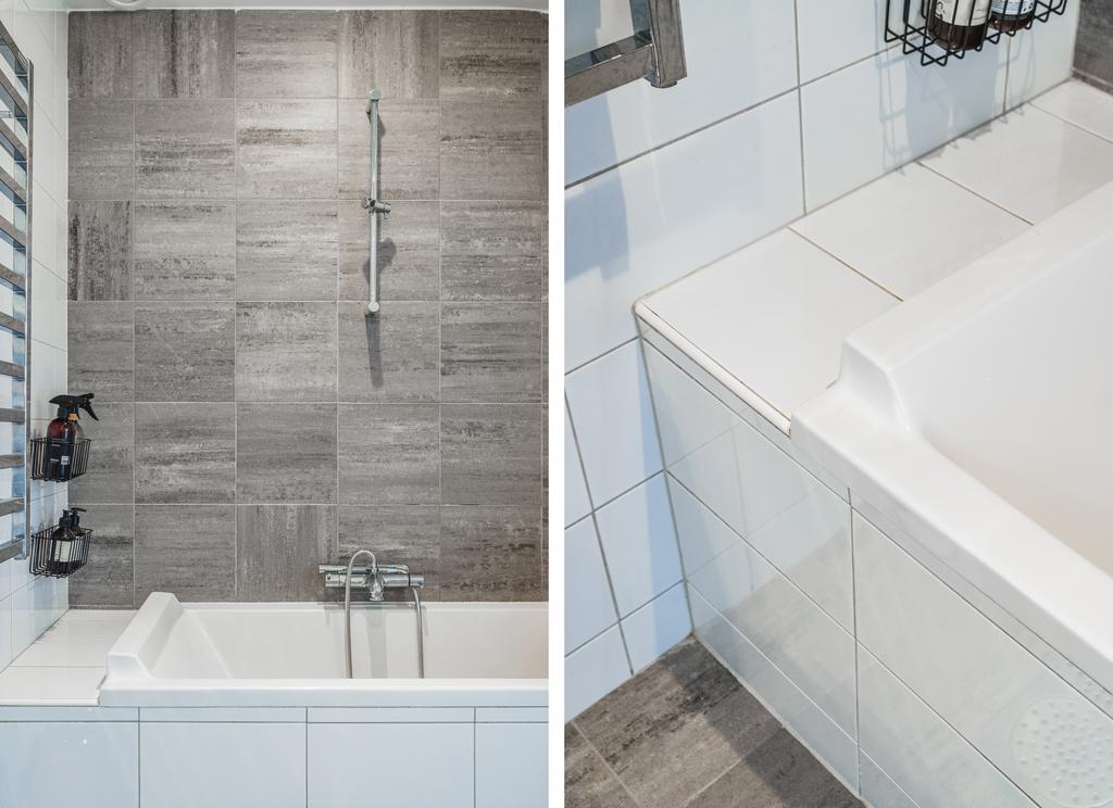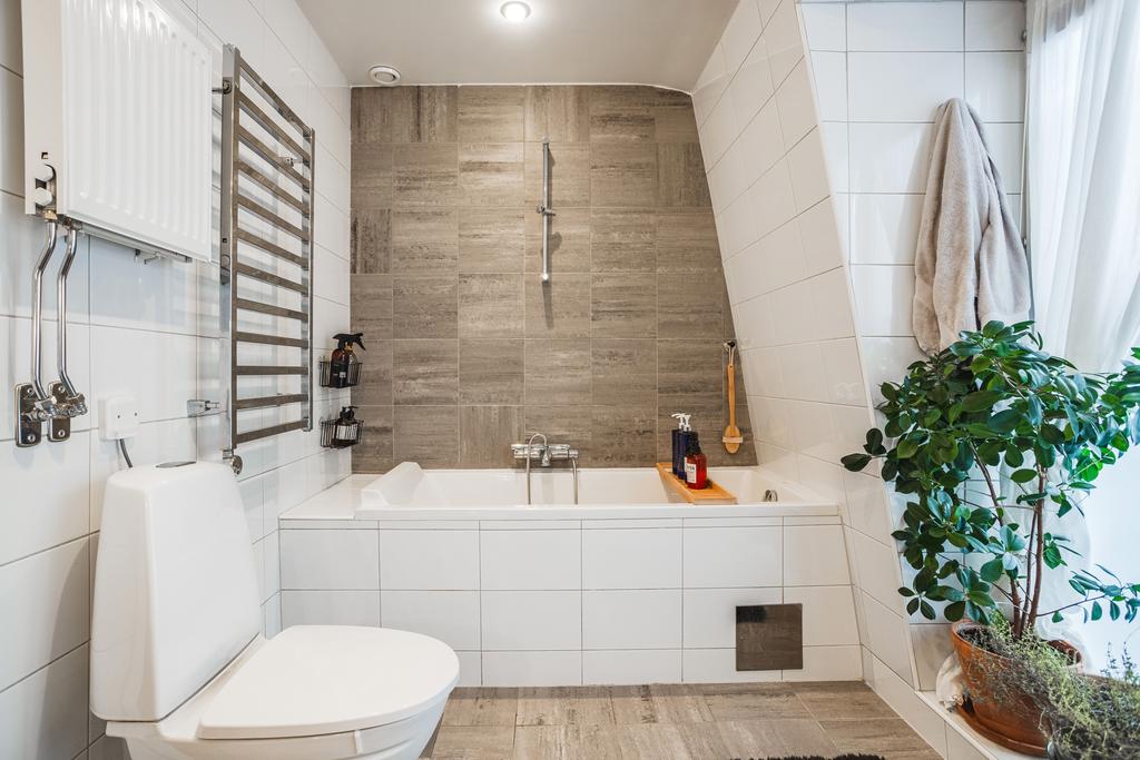 Det stilrena badrummet på övervåningen är fullt utrustat med helkaklade väggar, klinkergolv med golvvärme, badkar, fönster samt kombinerad tvättmaskin och torktumlare – både praktiskt och bekvämt.