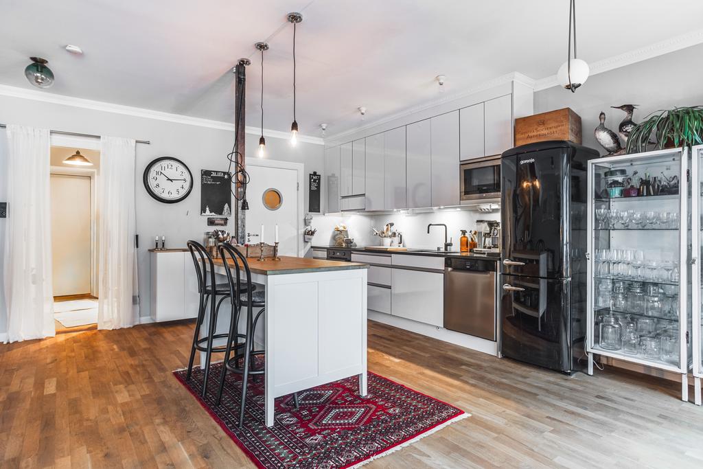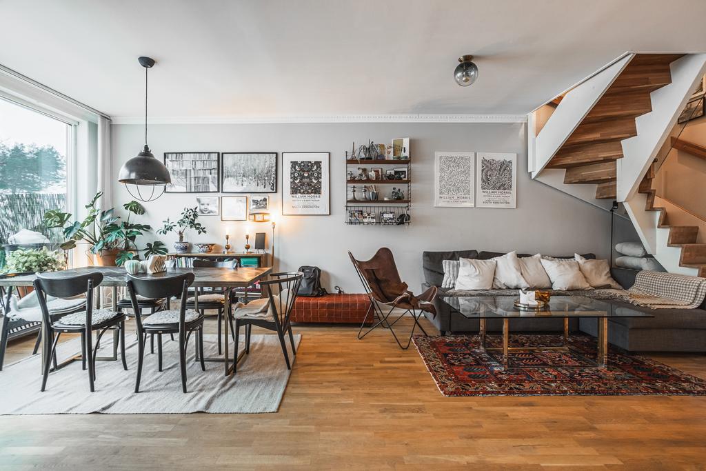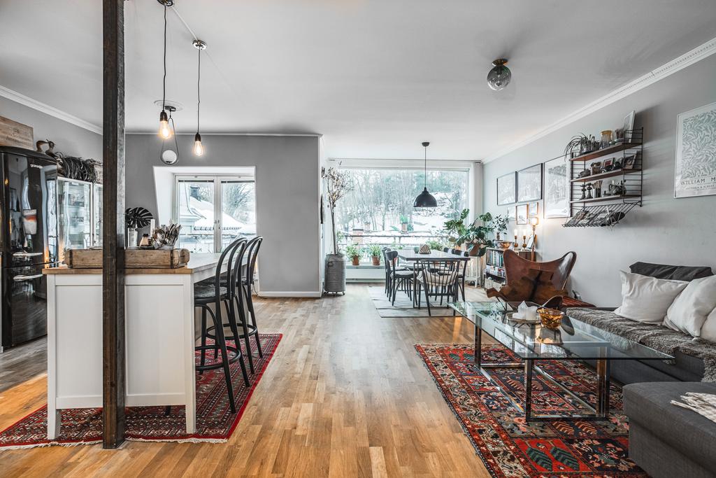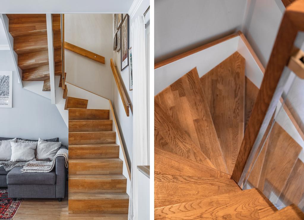 Hjärtat i bostaden är det öppna vardagsrummet och köket, där parkettgolv, panoramafönster och direkt utgång till en stor balkong i söderläge suddar ut gränsen mellan inne och ute. Här finns gott om plats för både soffgrupp och matbord – perfekt för såväl vardag som sociala tillställningar. Det moderna köket erbjuder vita släta luckor och full maskinell utrustning i en tidlös design. Trappan till övervåningen smälter naturligt in och förstärker den öppna känslan.