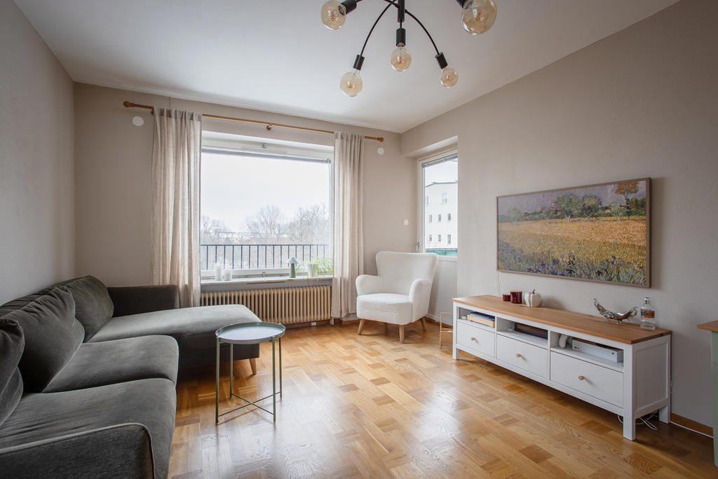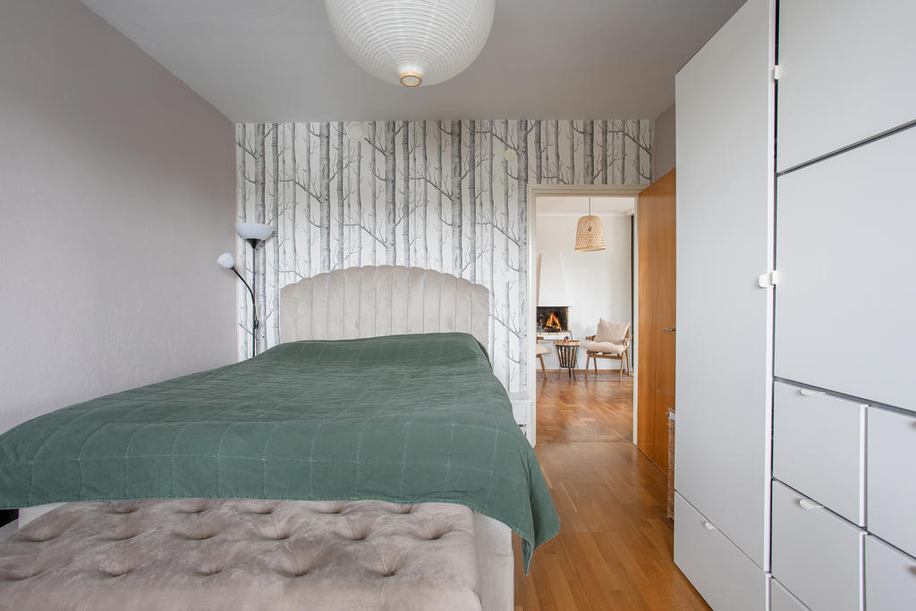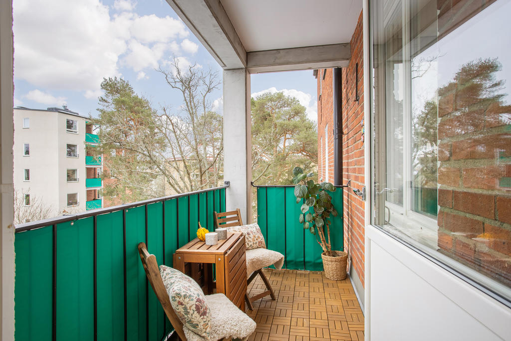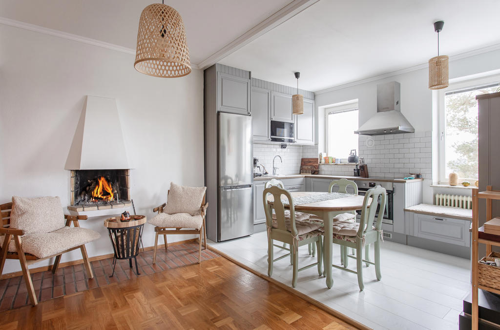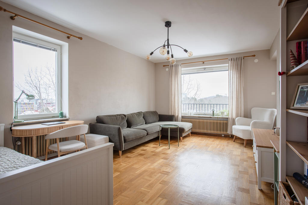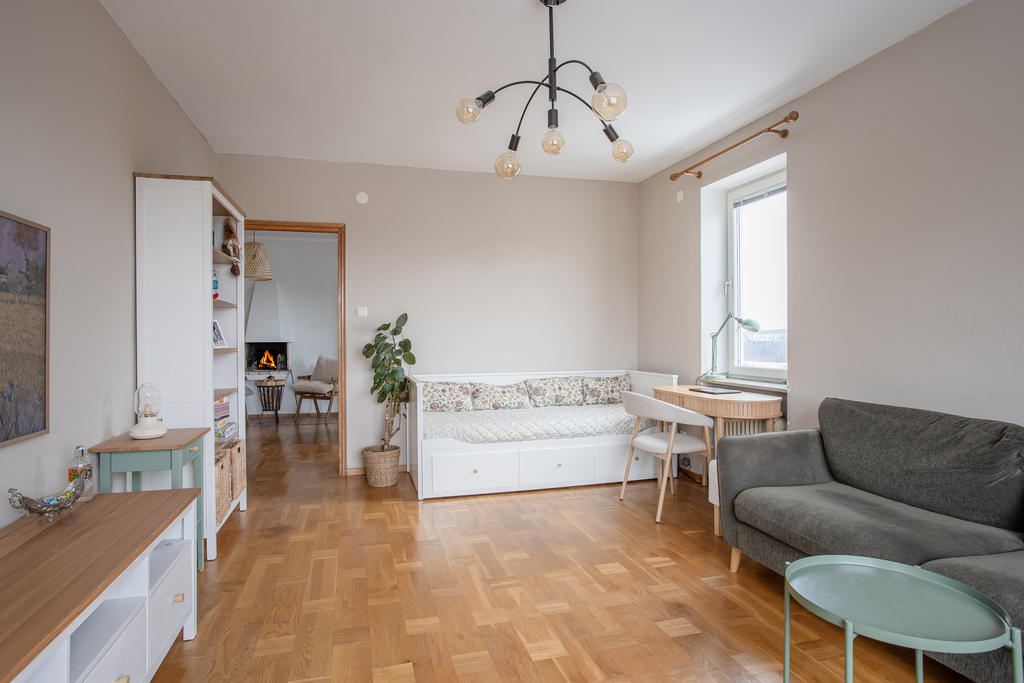 Högt belägen gavellägenhet med öppen spis och balkong