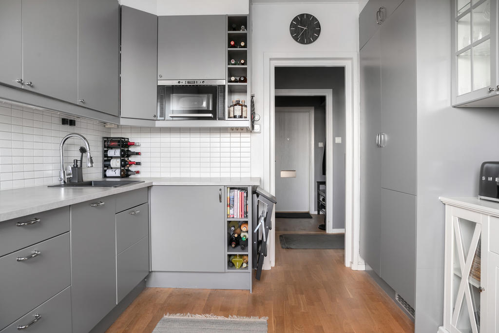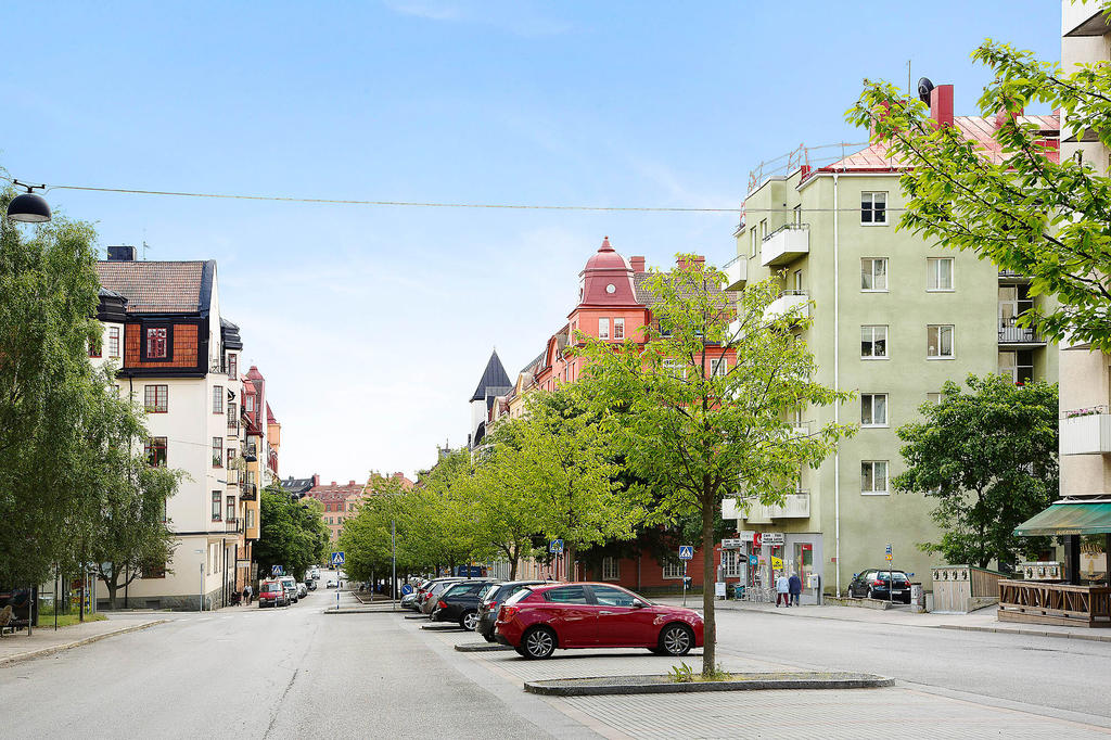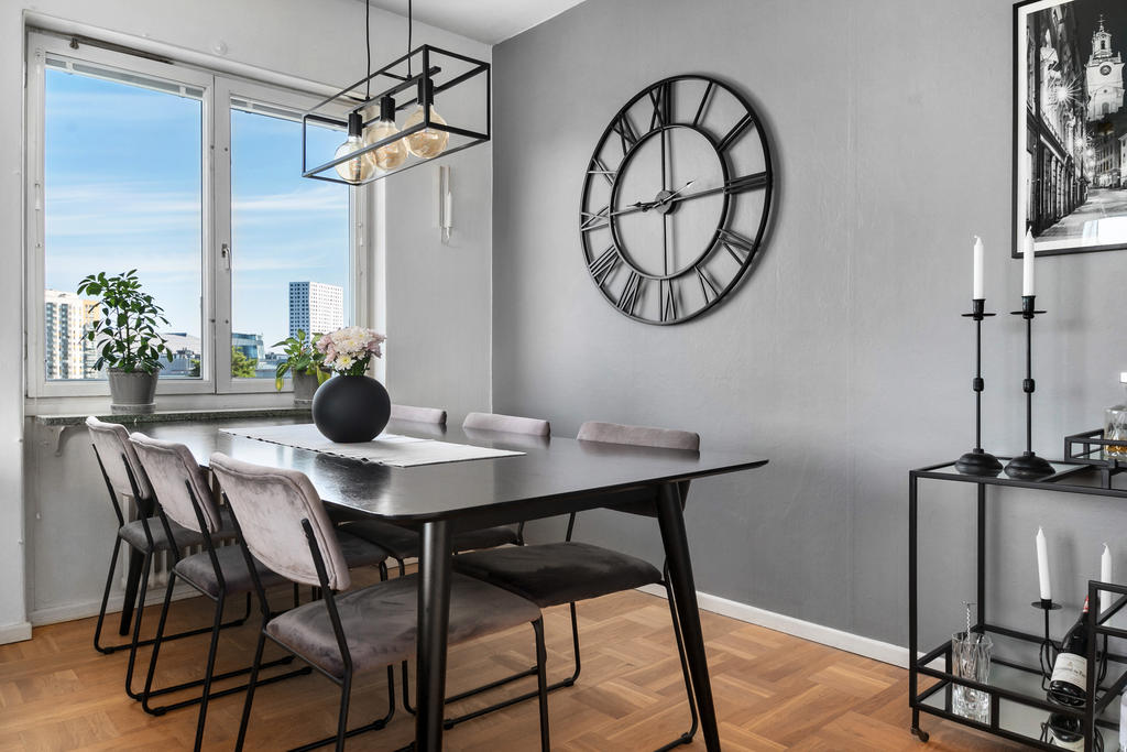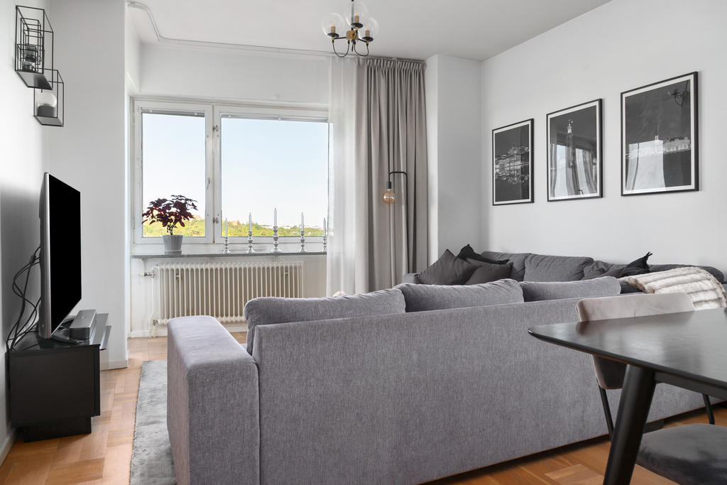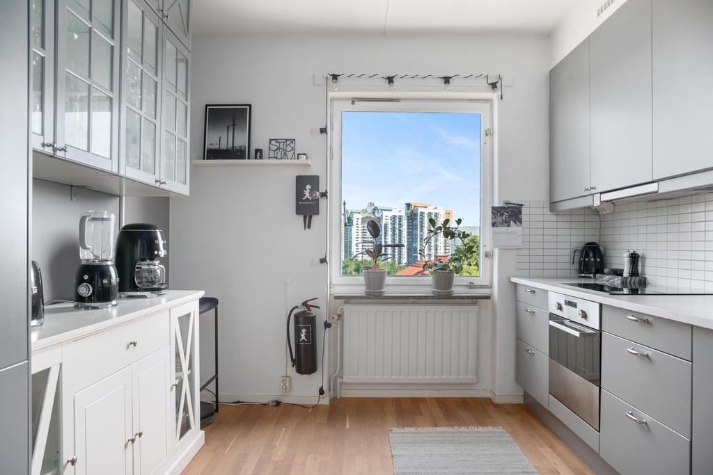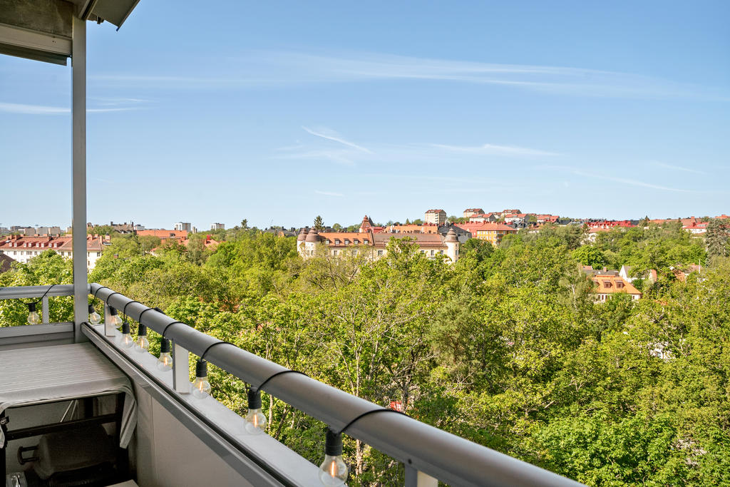 Insynsskyddad gavellägenhet högt upp i huset, belägen på en kulle som gör att man kommer betydligt högre upp än vad tredje våningen normalt innebär. Fin utsikt från alla fönster – kök, vardagsrum – och från balkongen har man ett fantastiskt solläge med vy över Råstasjön. Lägenheten är topprenoverad, så inga större åtgärder krävs. Våra gäster brukar ofta säga att lägenheten känns ”lyxig".