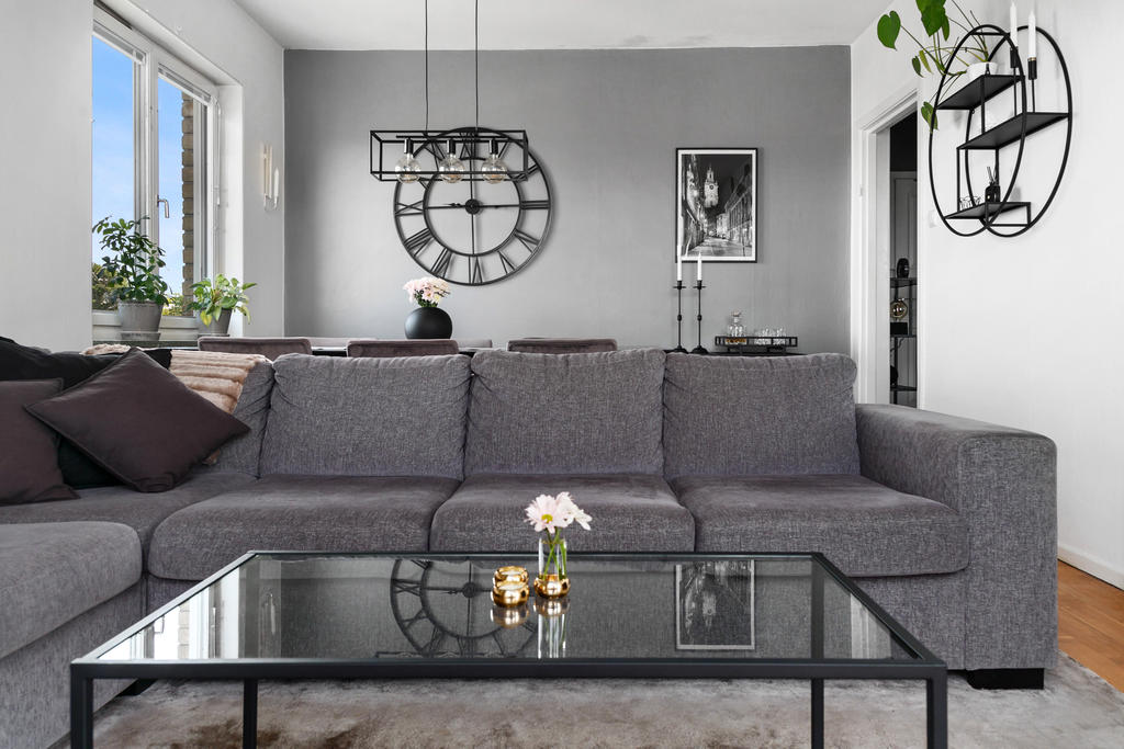 Vardagsrummet är ljust och rymligt och har fönster vid balkongdörren samt även ett gavelfönster där nuvarande matsalsbord är placerat. Vardagsrummet rymmer en väl tilltagen soffa.