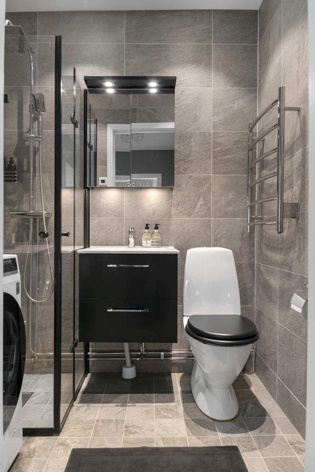 Lägenheten erbjuder ett helkaklat badrum med "hotell-känsla" där tvättmaskin finns installerat.
