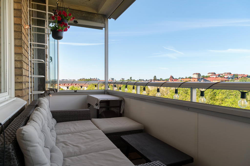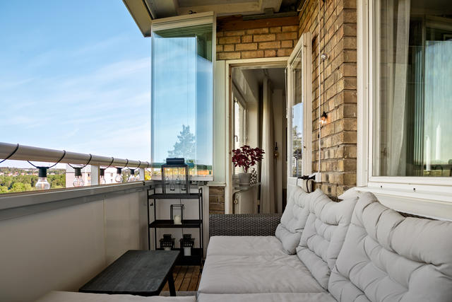 Access till den stora och helt inglasade balkongen får man via vardagsrummet. Här får man plats med bord, flera stolar eller en rejäl soffa för utomhusbruk.