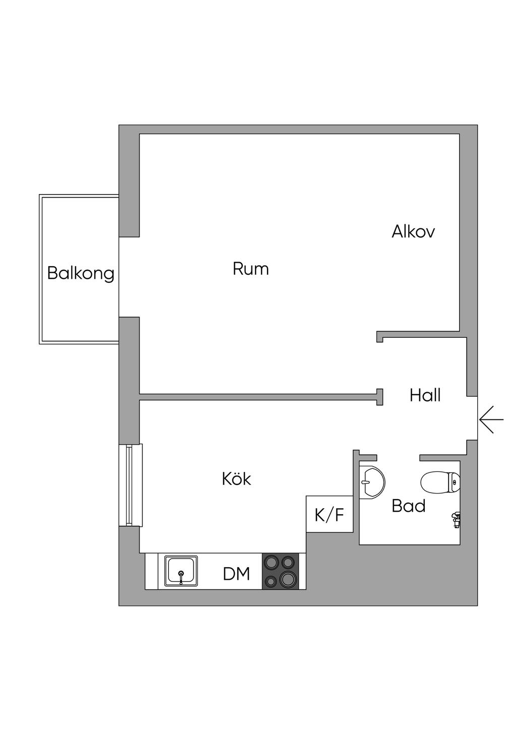 Den mysiga sovalkoven rymmer enkelt en större säng och garderobsvägg, vilket gör sovutrymmet både praktiskt och ombonat. Från vardagsrummet når du balkongen med utsikt över grönskande trädtoppar – en perfekt plats för morgonkaffe eller eftermiddagsfika i solen.