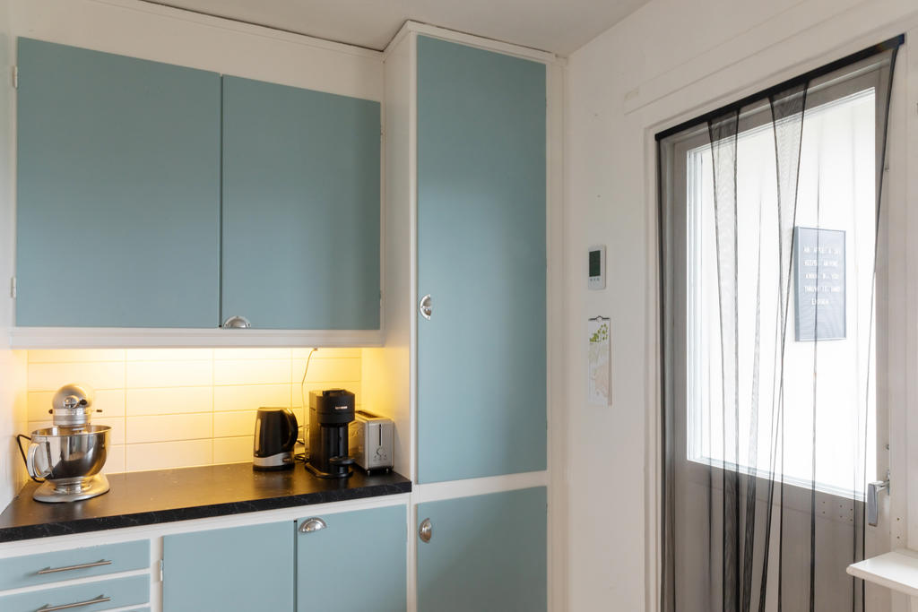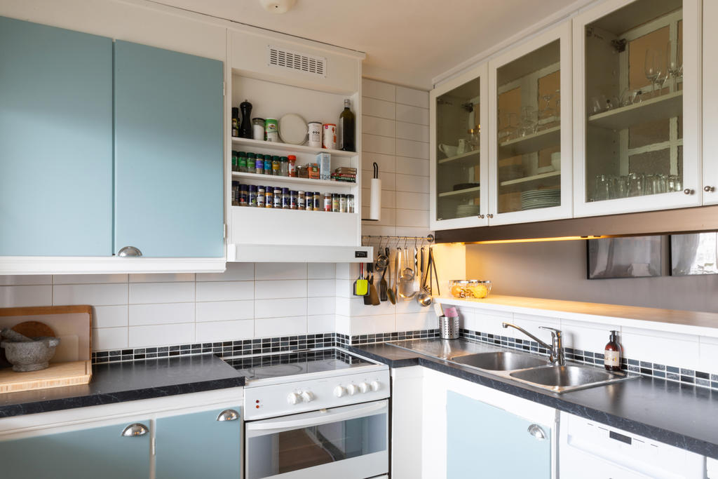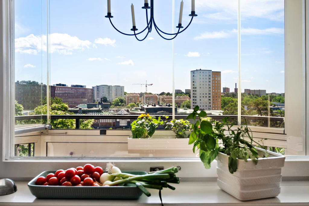 Bostadens hjärta är det stora vardagsrummet i öppen planlösning mot köket. Tack vare de generösa fönsterpartierna flödar ljuset in och skapar en inbjudande miljö med gott om plats för både en större soffgrupp, läshörna och ett rejält middagsbord för familj och vänner. Den öppna planlösningen ger en social och flexibel yta, och för den som önskar finns möjlighet att avskärma delar av rummet för att skapa ytterligare ett sovrum. Köket har bevarad originalcharm med vitt kakel, mörk laminatbänkskiva och gott om arbetsyta och förvaring. Här finns spis och ugn, kombinerad kyl och frys samt diskmaskin. Från kök och vardagsrum nås den inglasade balkongen med trätrall – en fantastisk förlängning av bostaden som kan nyttjas året runt. Här kan du njuta av solen i den platsbyggda soffan och blicka ut över Farstas trädtoppar och takåsar i en fri och rogivande utsikt.