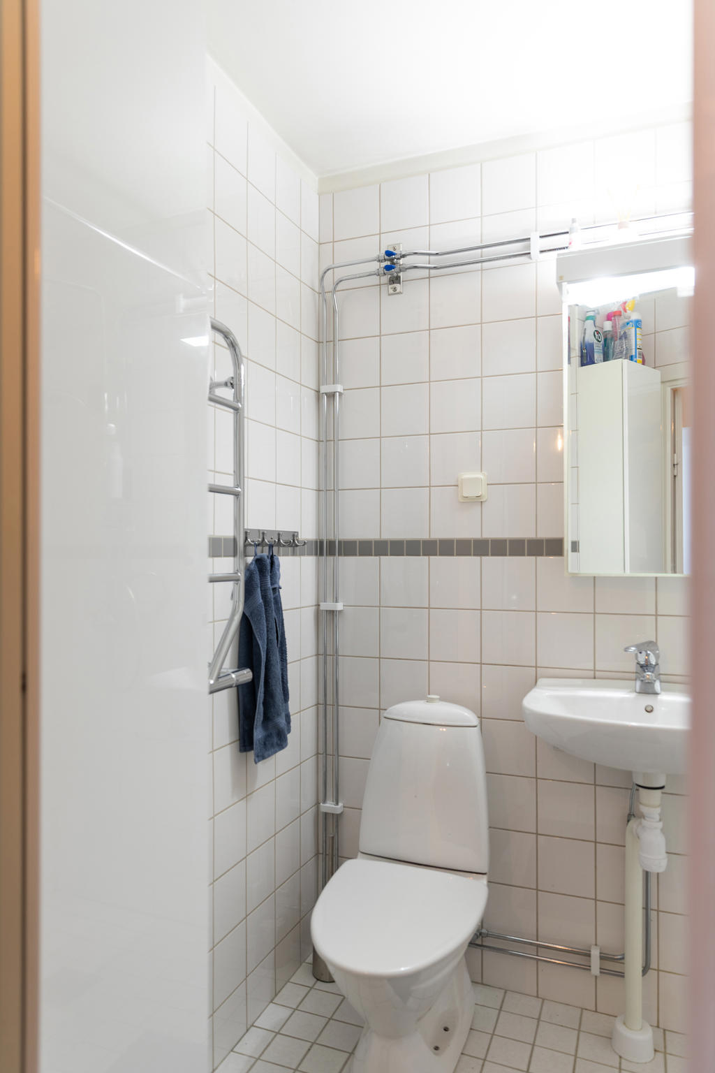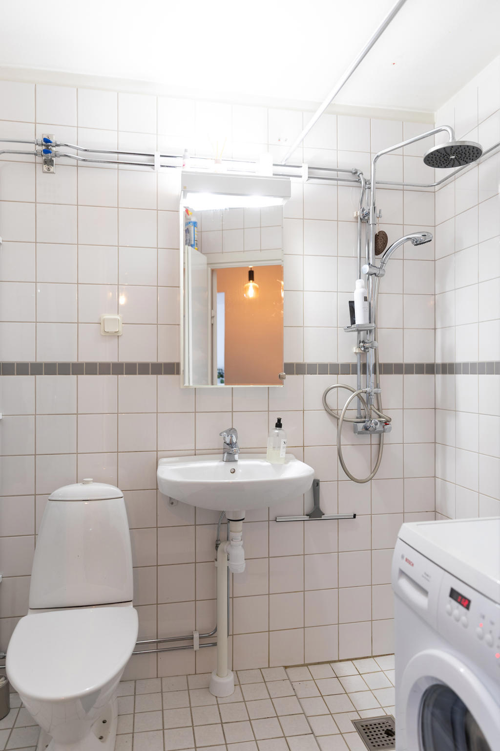 Badrummet är stambytt 2006 och håller en fräsch och tidlös standard med vita kaklade väggar och vitt klinkergolv. Här finns wc, tvättställ, spegelskåp, stort högskåp, handdukstork, takdusch samt tvättmaskin för extra bekvämlighet. I huset finns dessutom en lättillgänglig och modern tvättstuga.