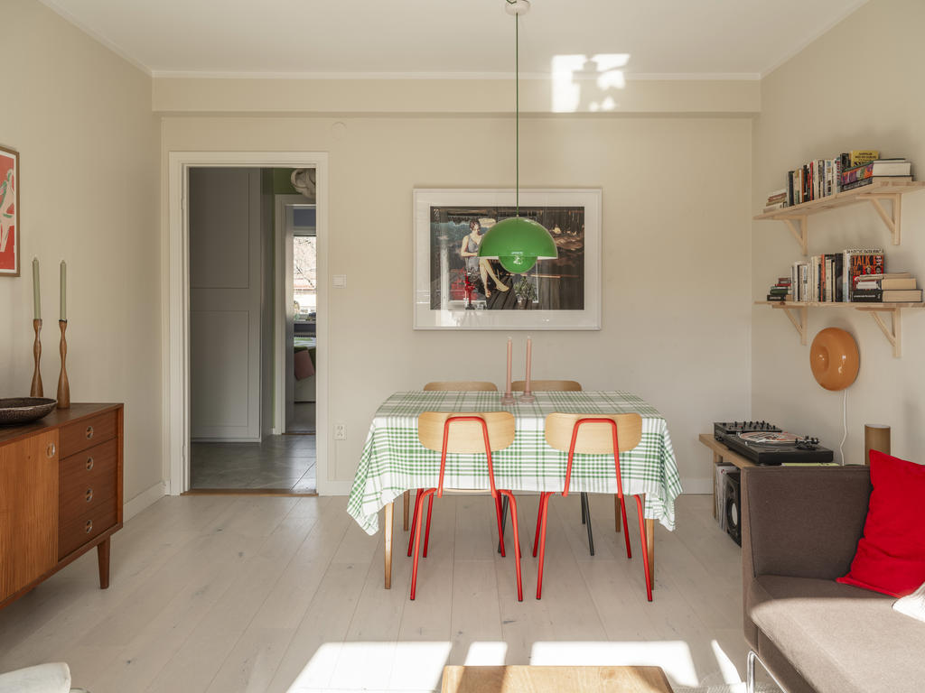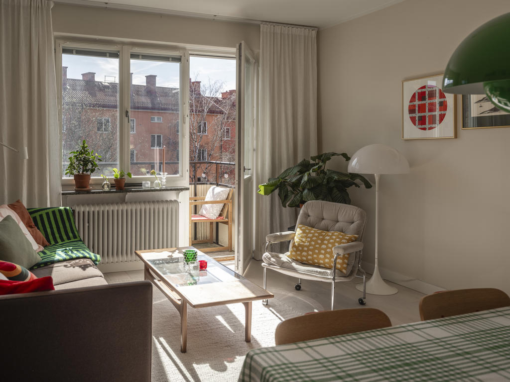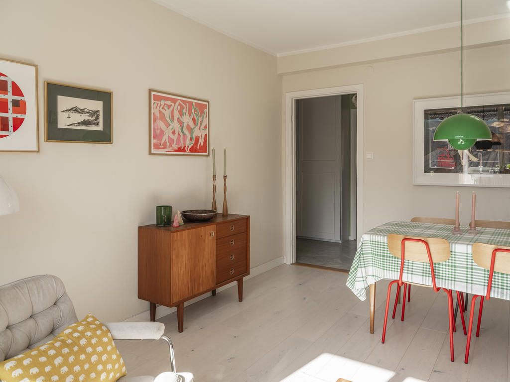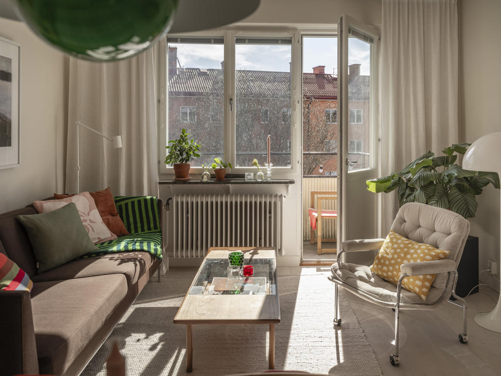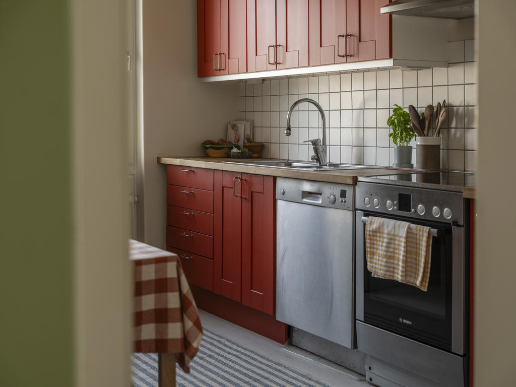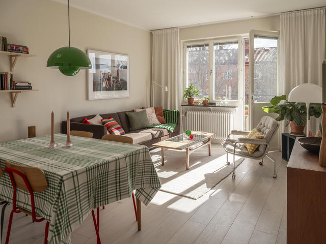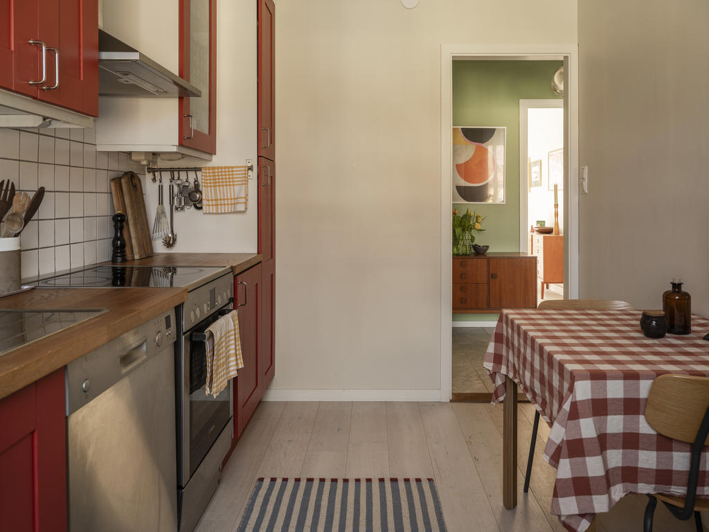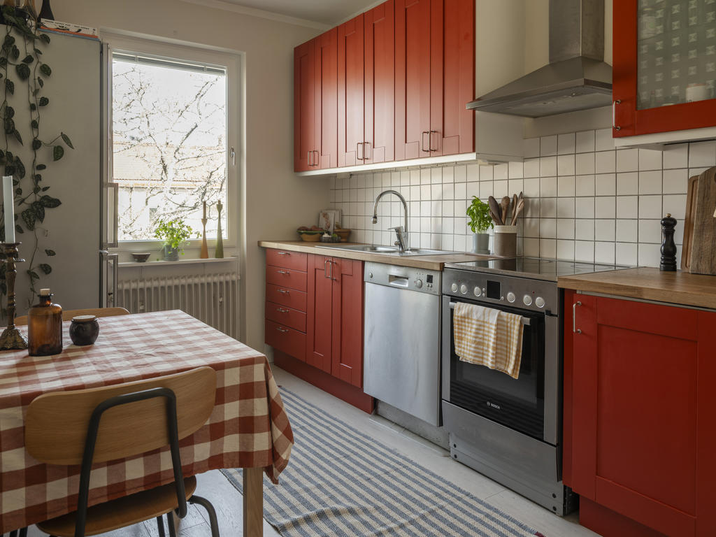 Det charmiga köket går i en härlig och modern färgsättning med röda luckor som kontrasterar snyggt mot ljusa kakelväggar och bänkskiva i trä. Här finns gott om arbetsyta och plats för matbord – perfekt för både vardagsmiddagar och sociala tillfällen. Vardagsrummet är ljust och luftigt med stora fönster och plats för både soffgrupp och matplats. Härifrån nås bostadens balkong i soligt söderläge, där du kan njuta av många soltimmar och utsikt över lummiga omgivningar.