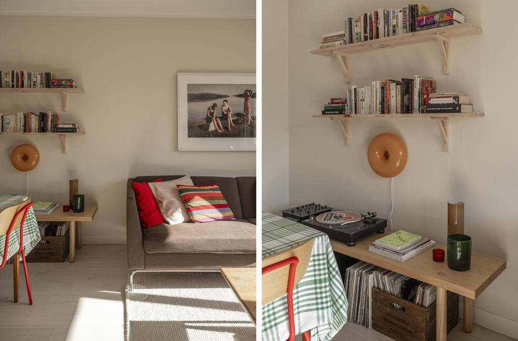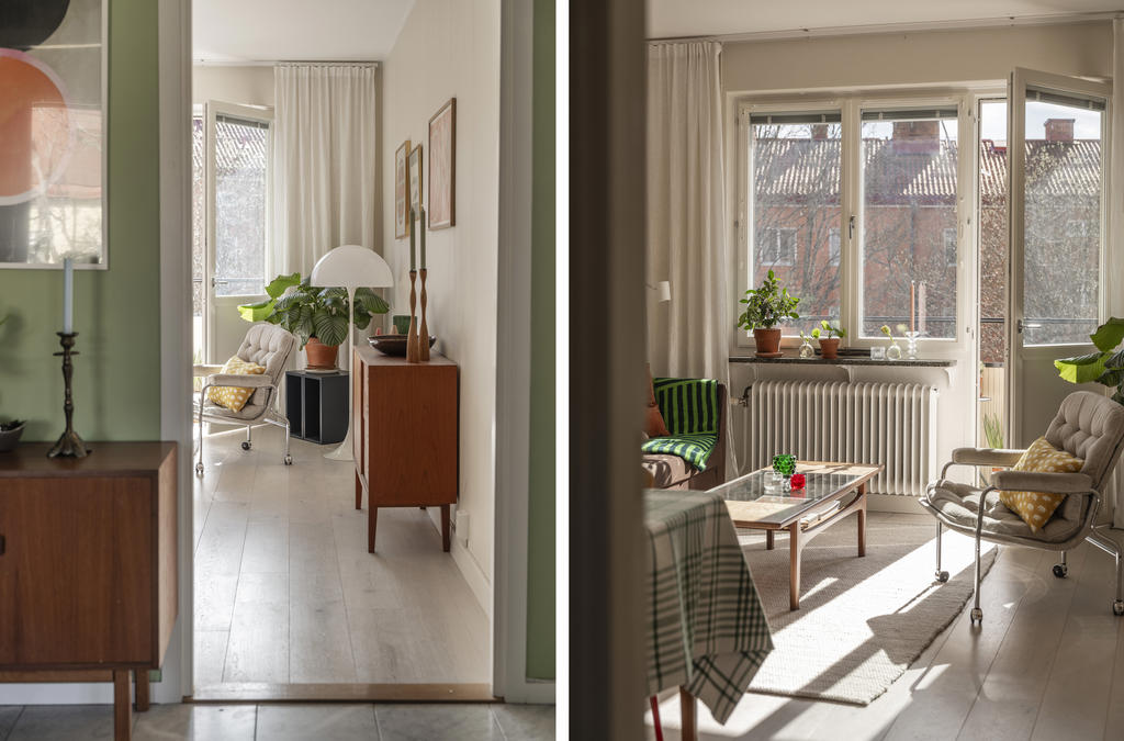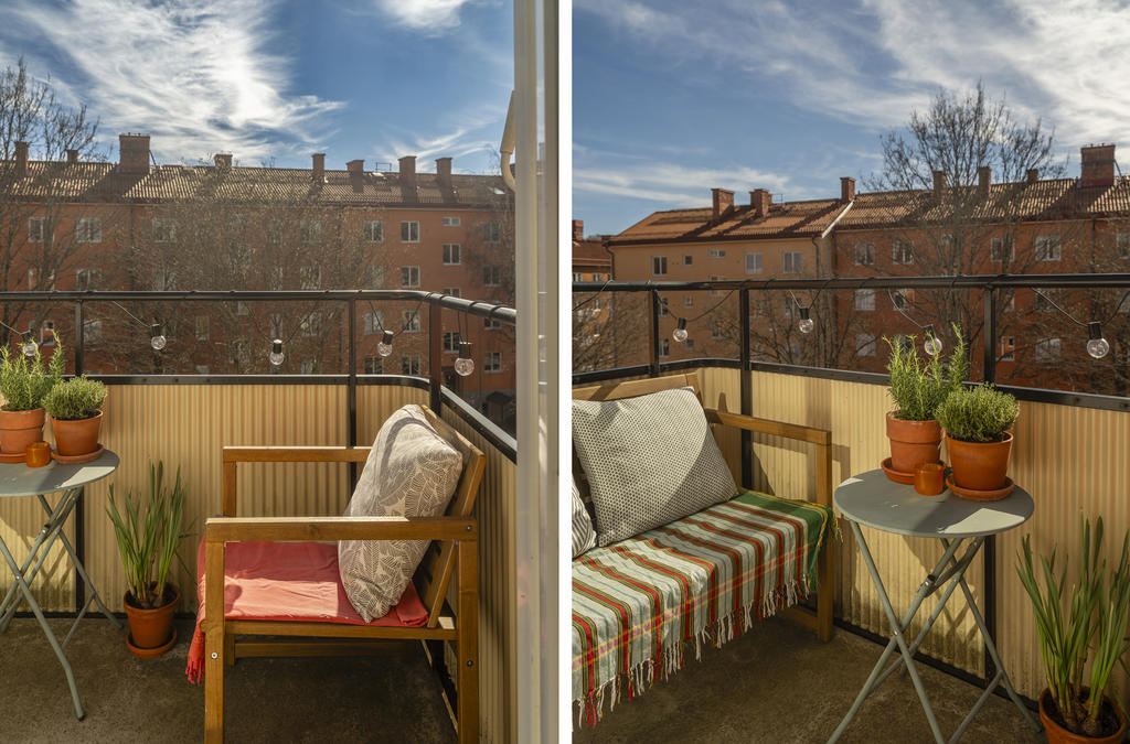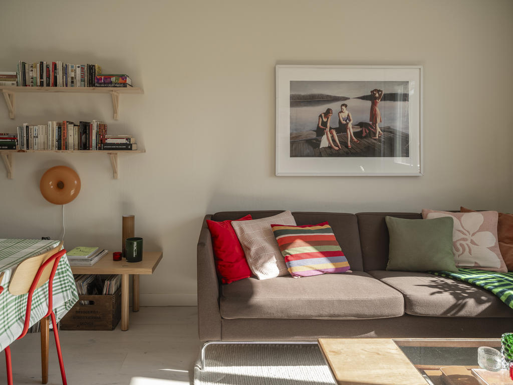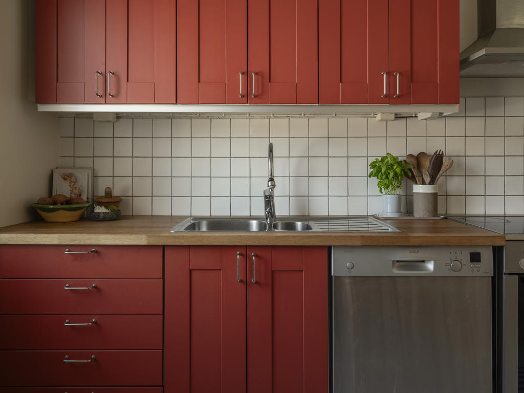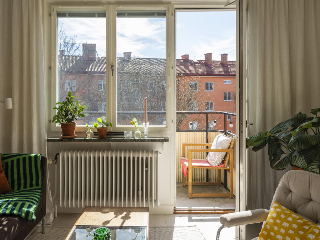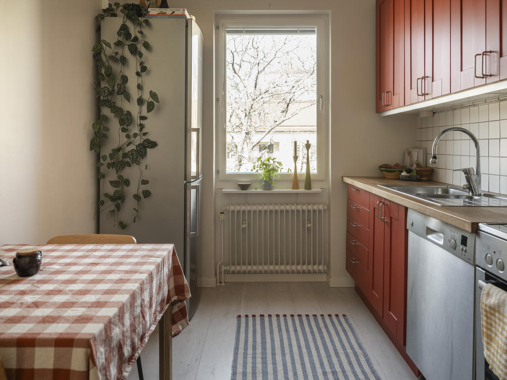 Det charmiga köket går i en härlig och modern färgsättning med röda luckor som kontrasterar snyggt mot ljusa kakelväggar och bänkskiva i trä. Här finns gott om arbetsyta och plats för matbord – perfekt för både vardagsmiddagar och sociala tillfällen. Vardagsrummet är ljust och luftigt med stora fönster och plats för både soffgrupp och matplats. Härifrån nås bostadens balkong i soligt söderläge, där du kan njuta av många soltimmar och utsikt över lummiga omgivningar.