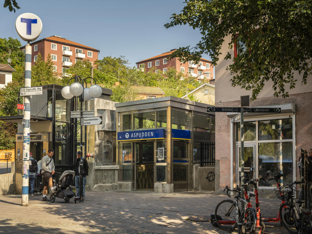Fastigheten ligger ett stenkast bort från Aspuddens Centrum med T-bana, välsorterad ICA, apotek, bibliotek och trevliga caféer.