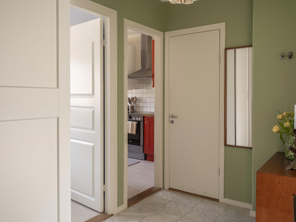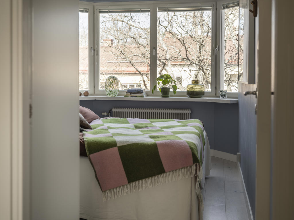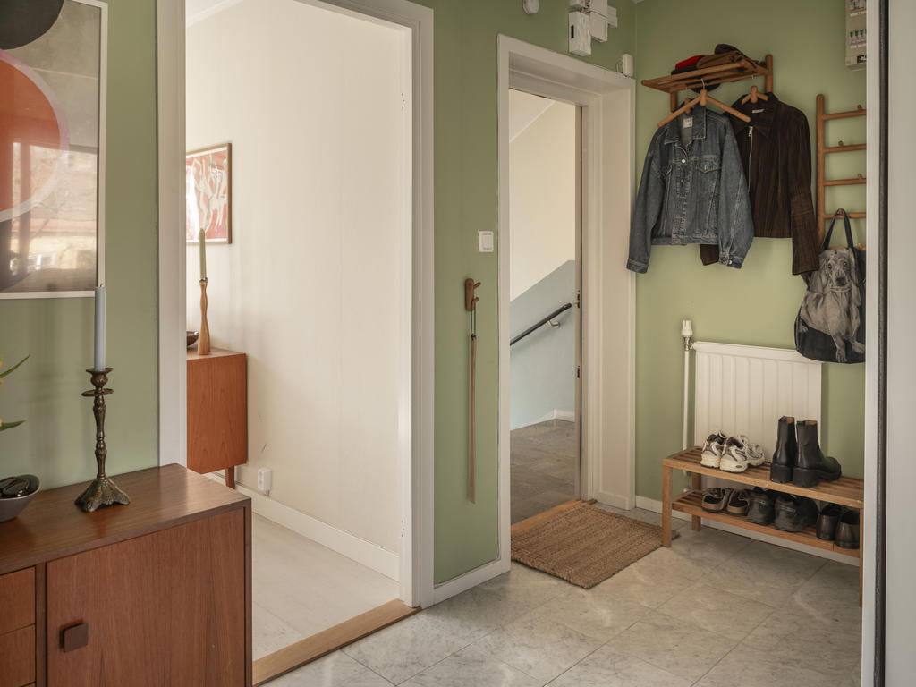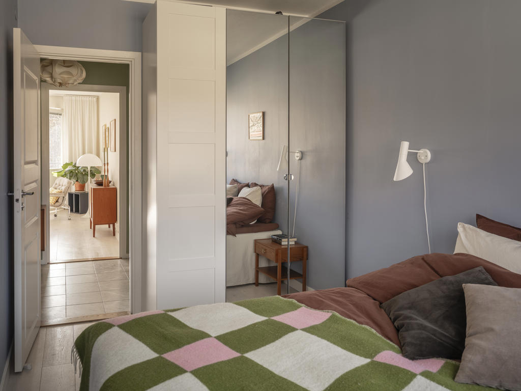 Sovrummet är rofyllt och tyst beläget mot innergården, med lugna färgval och plats för dubbelsäng samt praktisk förvaring via garderobsvägg. Badrummet är stilrent och funktionellt med dusch, handfat, WC och goda förvaringsmöjligheter. Ljus kakelsättning som bidrar till en tidlös helhet. Genomgående präglas bostaden av fina detaljer, en harmonisk färgskala och smart disponerade ytor som skapar ett hem där varje kvadratmeter verkligen kommer till sin rätt.