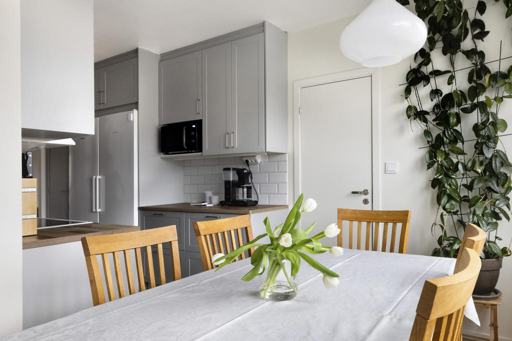 Stort kök och ljusa sociala ytor