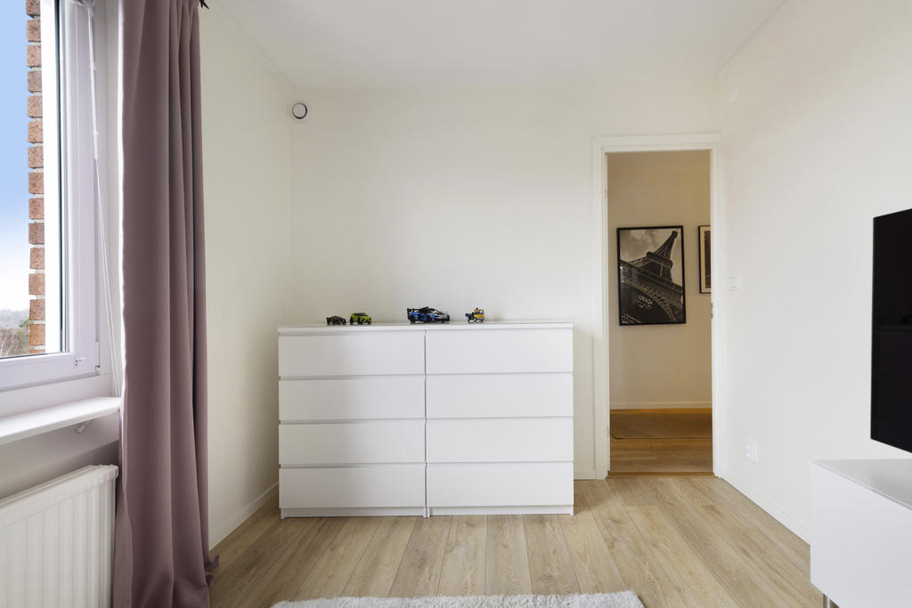 Lägenheten är utformad för att göra vardagen smidig. Längs den breda korridoren, som elegant avdelar sovrummen, finns platsbyggda garderober med gott om utrymme för kläder, skor och andra tillhörigheter. Här behöver du aldrig oroa dig för att förvaringen inte räcker till.