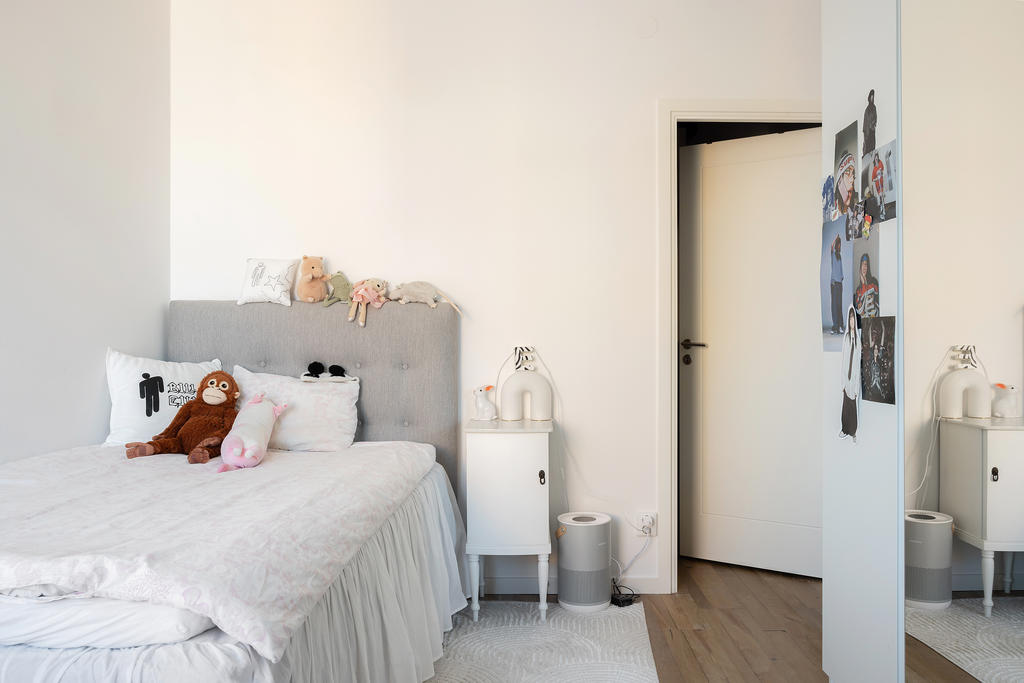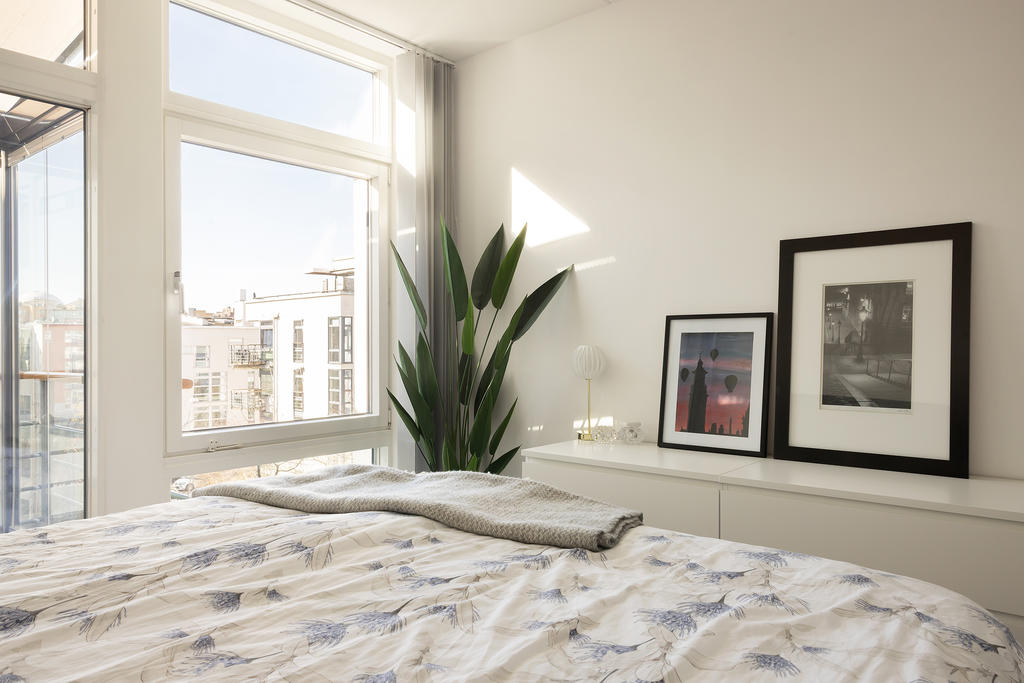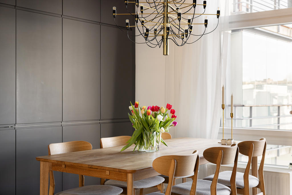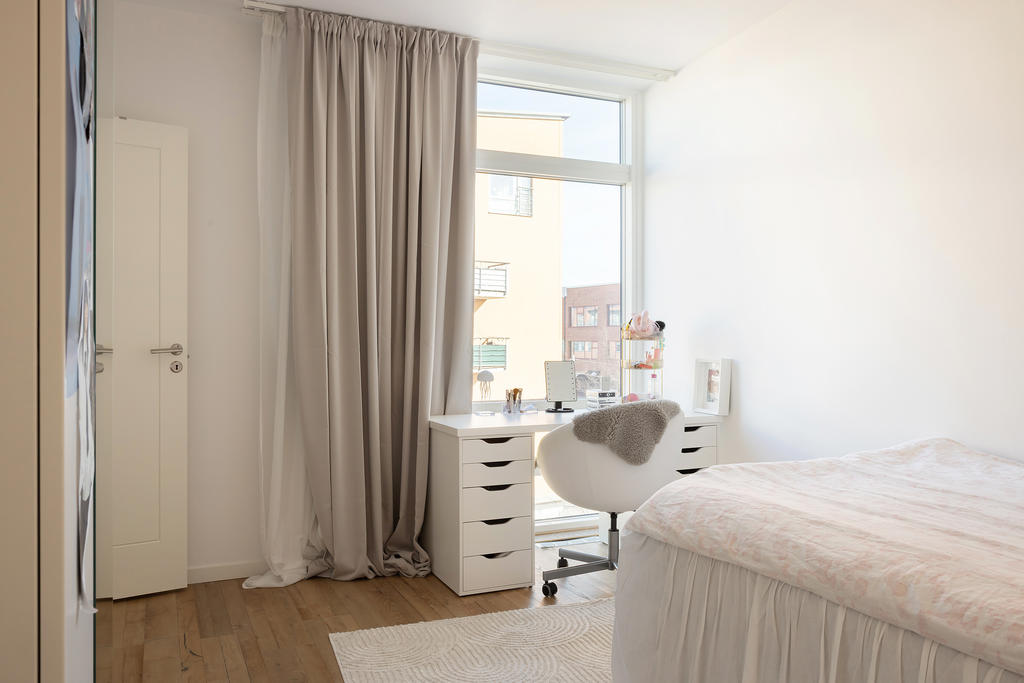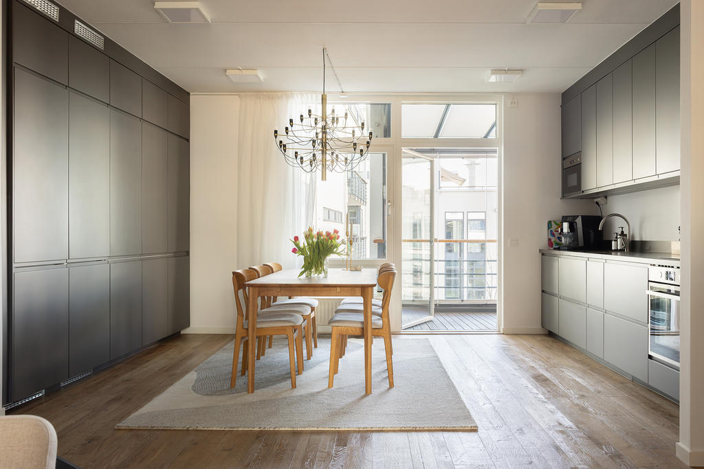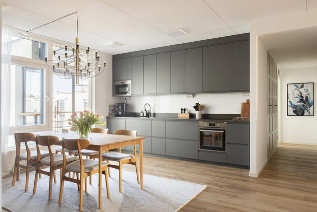 Bostaden bjuder på ett fantastiskt ljus tack vare den generösa takhöjden och de stora fönsterpartier från golv till tak i två väderstreck.