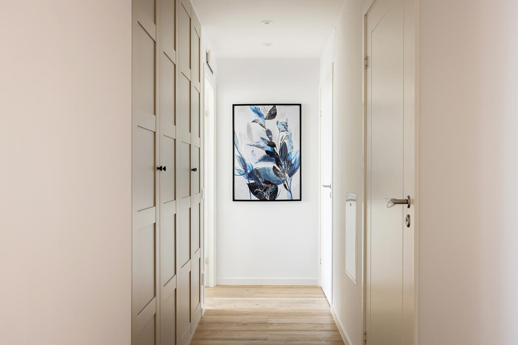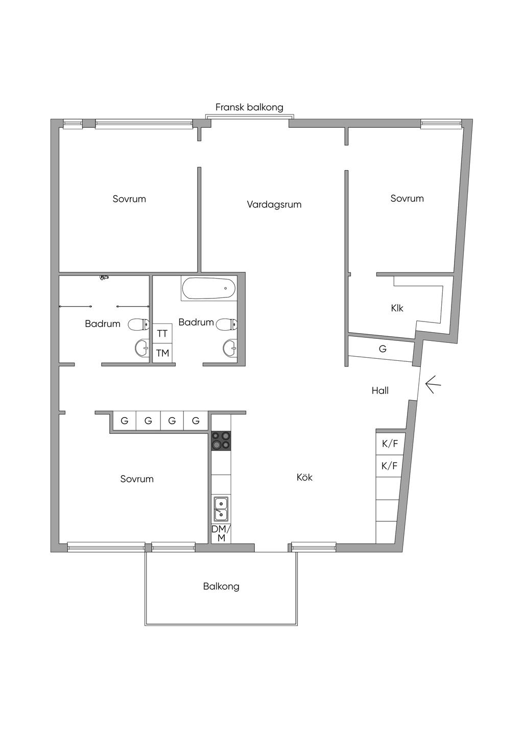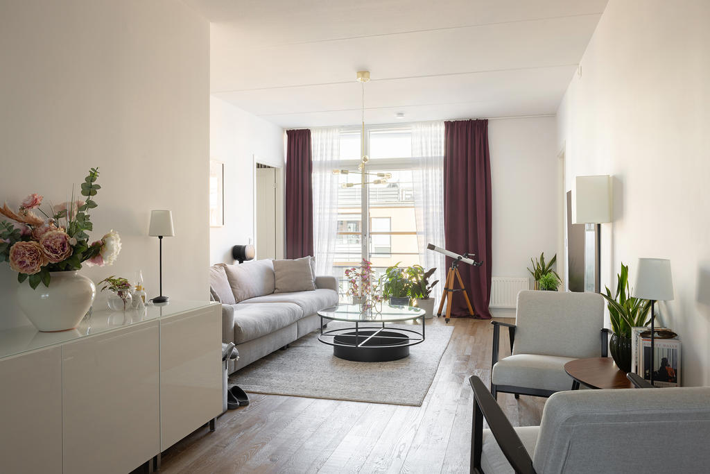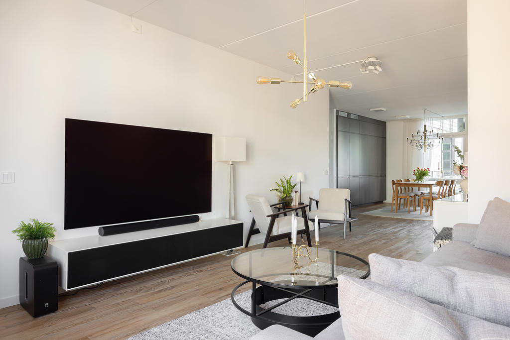 Bostaden bjuder på ett fantastiskt ljus tack vare den generösa takhöjden och de stora fönsterpartier från golv till tak i två väderstreck.