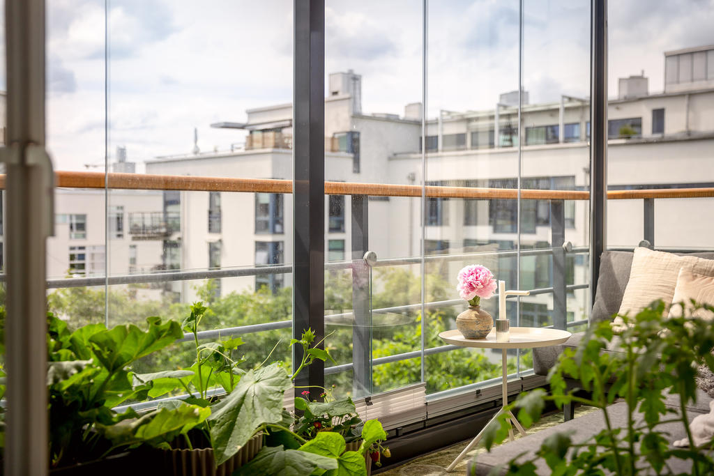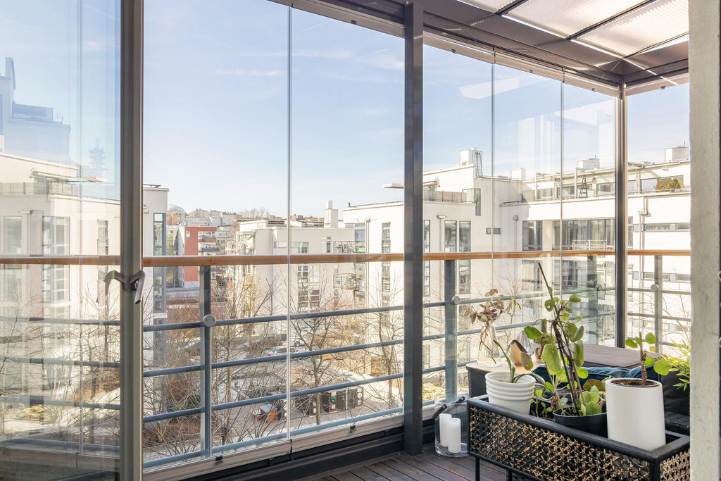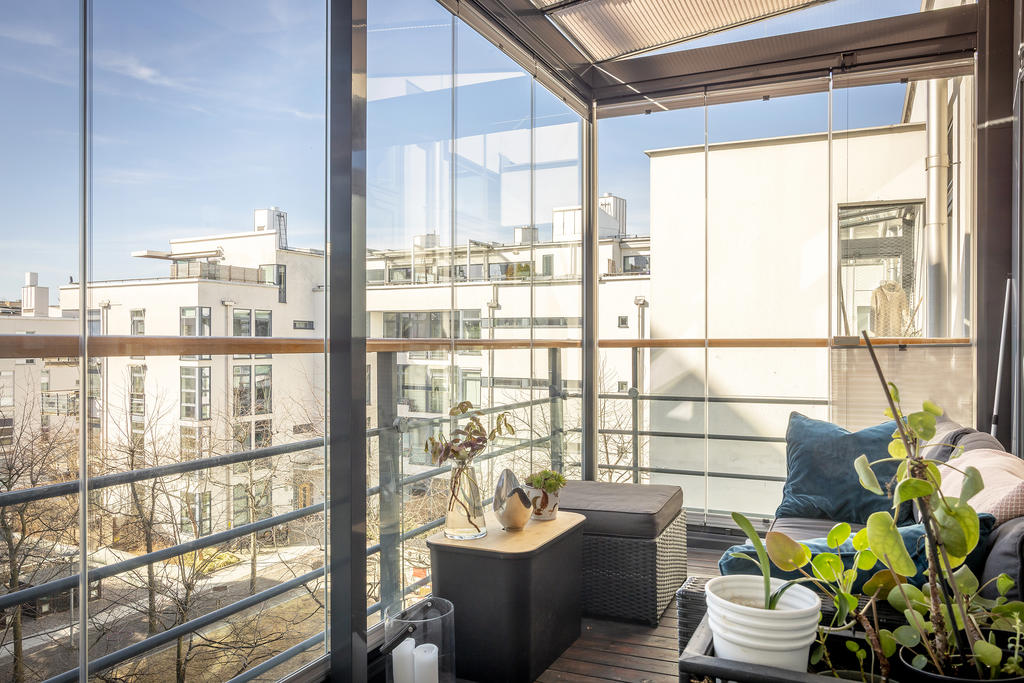 Balkongen är fantastisk och en stor tillgång året om, tack vare inglasningen. Här kan man njuta av sol från lunchtid till kvällen om vår och sommarmånaderna.