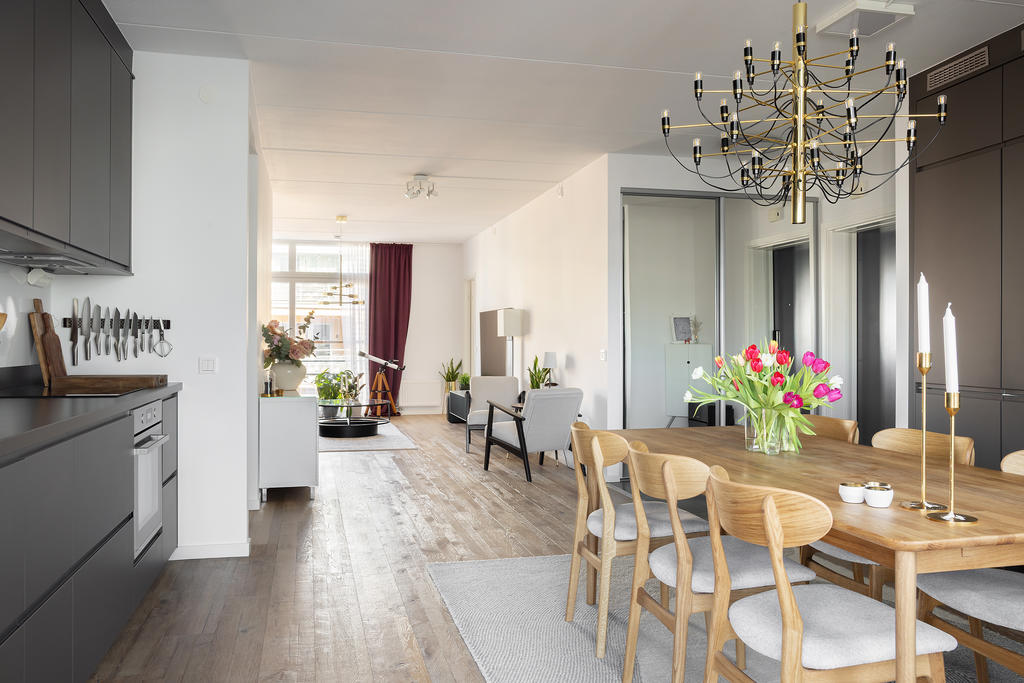 Vardagsrum och kök ligger i öppen anslutning med varandra men ändå uppdelat, vilket ger en väldigt luftig känsla och lättmöblerade ytor.