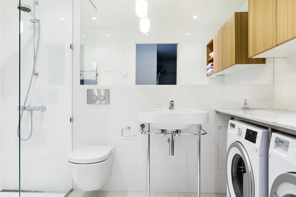 Exklusivt badrum i sober färgsättning som man bara älskar. Utrustat med tvättmaskin och torktumlare. Plats finns för badkar!