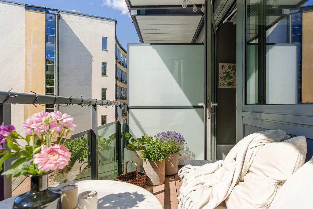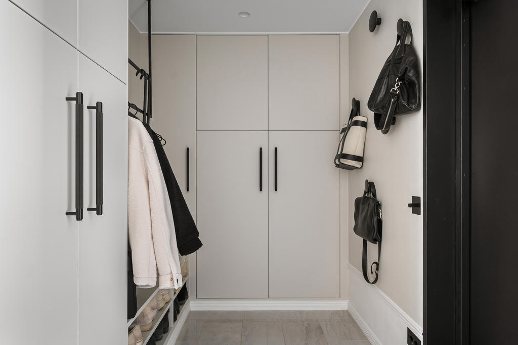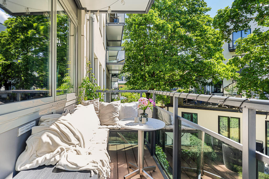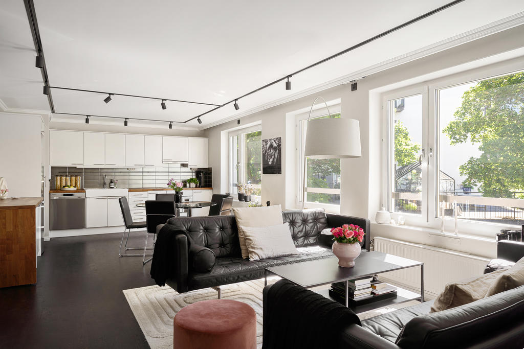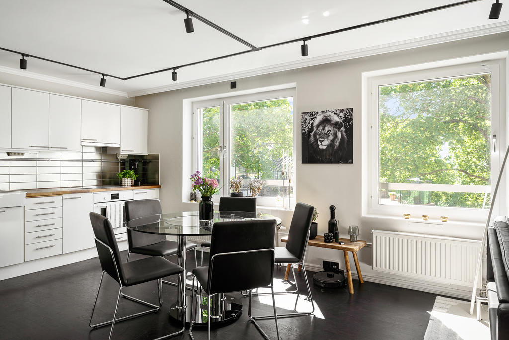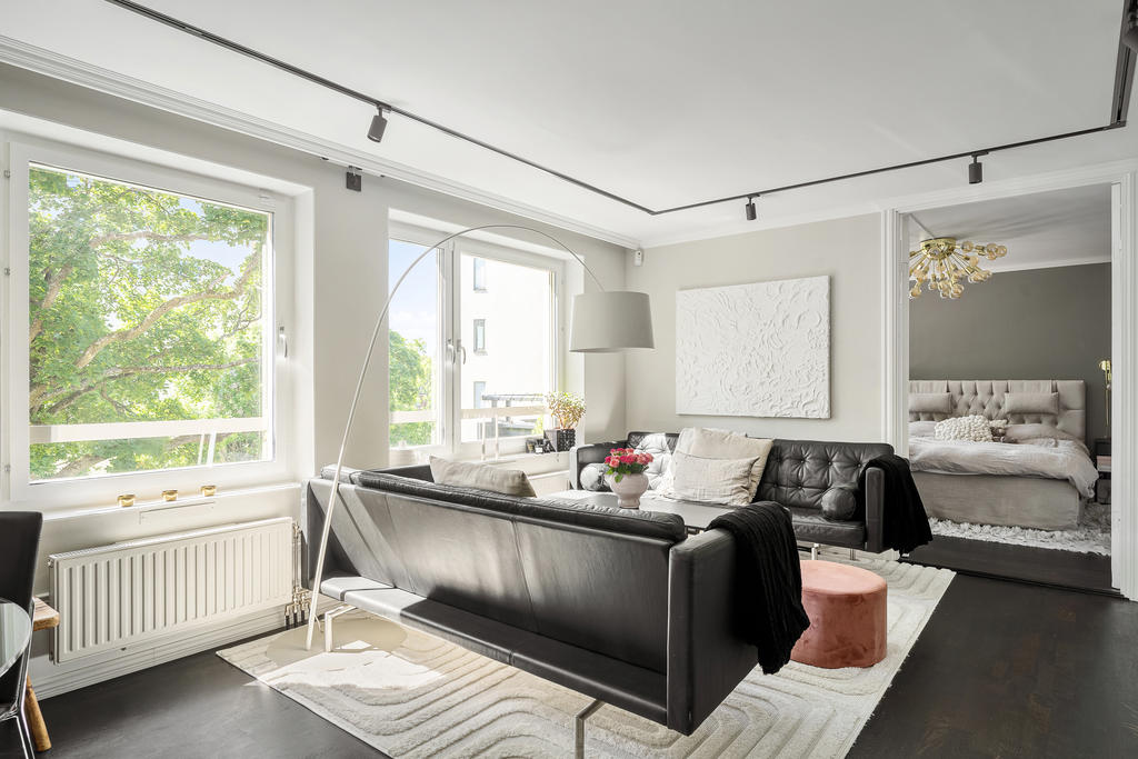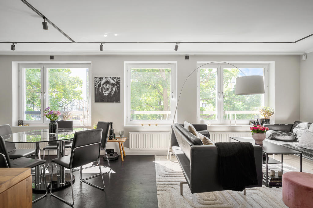 Redan i hallen möts du av generösa avhängningsmöjligheter i stilrena, platsbyggda garderober som skapar både ordning och ett elegant första intryck. Bostaden präglas genomgående av en välplanerad och integrerad belysning som lyfter fram materialvalen och skapar en varm, exklusiv atmosfär. Genomtänkta detaljer såsom strömbrytare och eluttag i matt svart från Buster + Punch bidrar till ett modernt och enhetligt uttryck. Bostaden öppnar upp sig mot ett luftigt och inbjudande sällskapsrum i öppen planlösning med köket. De stora fönsterpartierna i fil ger ett fantastiskt ljusinsläpp och förstärker känslan av rymd. Det moderna köket är fullt utrustat med diskmaskin, ugn, spis, fläkt, mikrovågsugn, kyl och frys samt en exklusiv vinkyl – perfekt för den som uppskattar det lilla extra. Här finns gott om plats för både en generös matplats och en bekväm soffgrupp, vilket gör bostaden idealisk för sociala tillställningar. Sovrummet är rymligt och rofyllt beläget mot en grönskande baksida. Här erbjuds en lyxig walk-in closet med heltäckningsmatta, automatiserad belysning och mycket goda förvaringsmöjligheter. Förvaring är genomgående väl tilltagen i hela bostaden, vilket gör det enkelt att hålla ett stilrent och organiserat hem. Från sovrummet nås även bostadens fantastiska balkong – en privat oas utan insyn där du kan njuta av lugna stunder med morgonkaffet eller ett glas vin i kvällssolen. Det exklusivt renoverade badrummet håller en mycket hög standard och är smakfullt utformat med dubbla integrerade takduschar, golvvärme och dubbla handfat. Här finns även en spegel med integrerad belysning, stilren kommod med god förvaring, vägghängd toalett samt praktiska inbyggda hyllor. Badrummet är dessutom utrustat med tvättmaskin och förberett utrymme för torktumlare – en perfekt kombination av funktion och lyx.