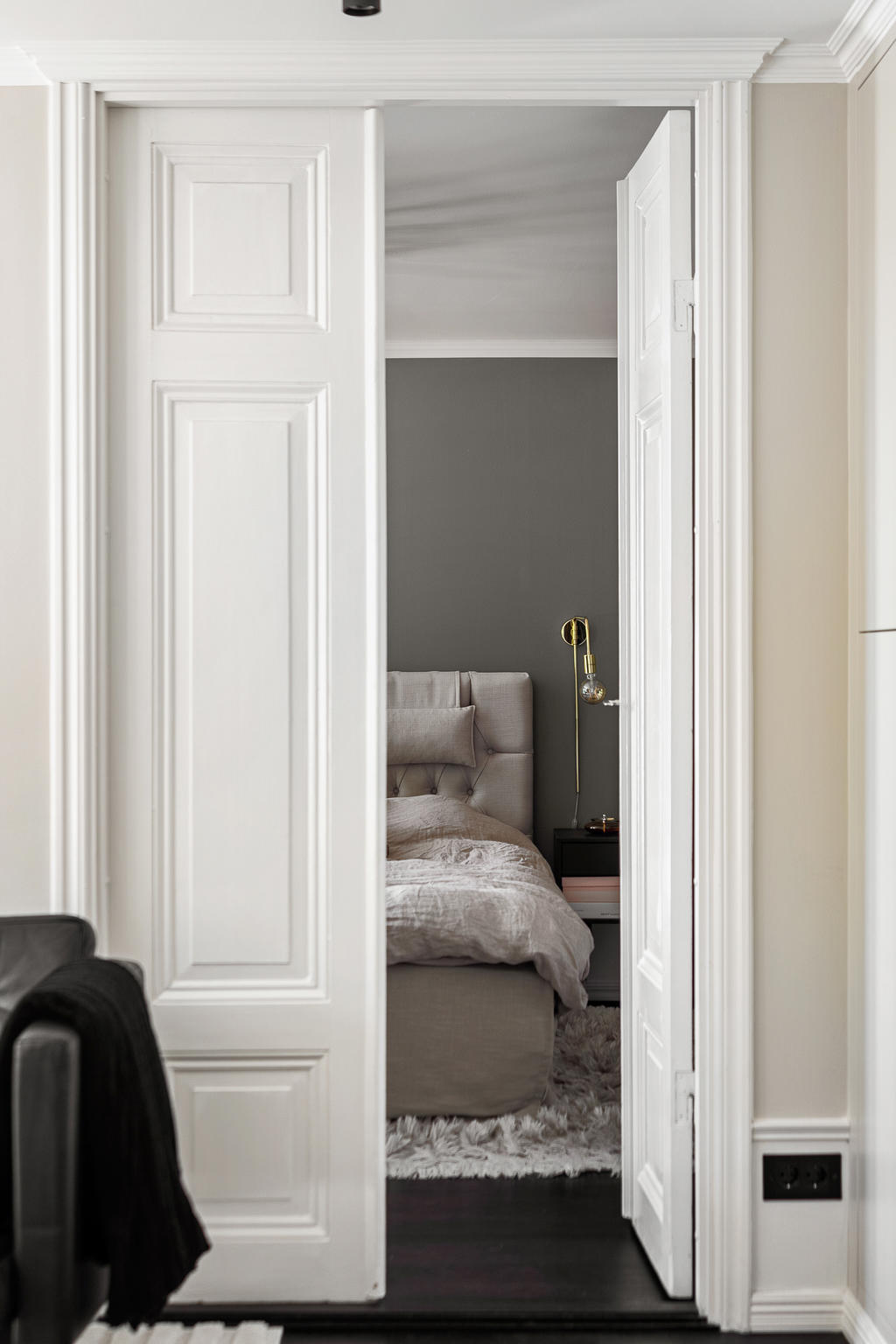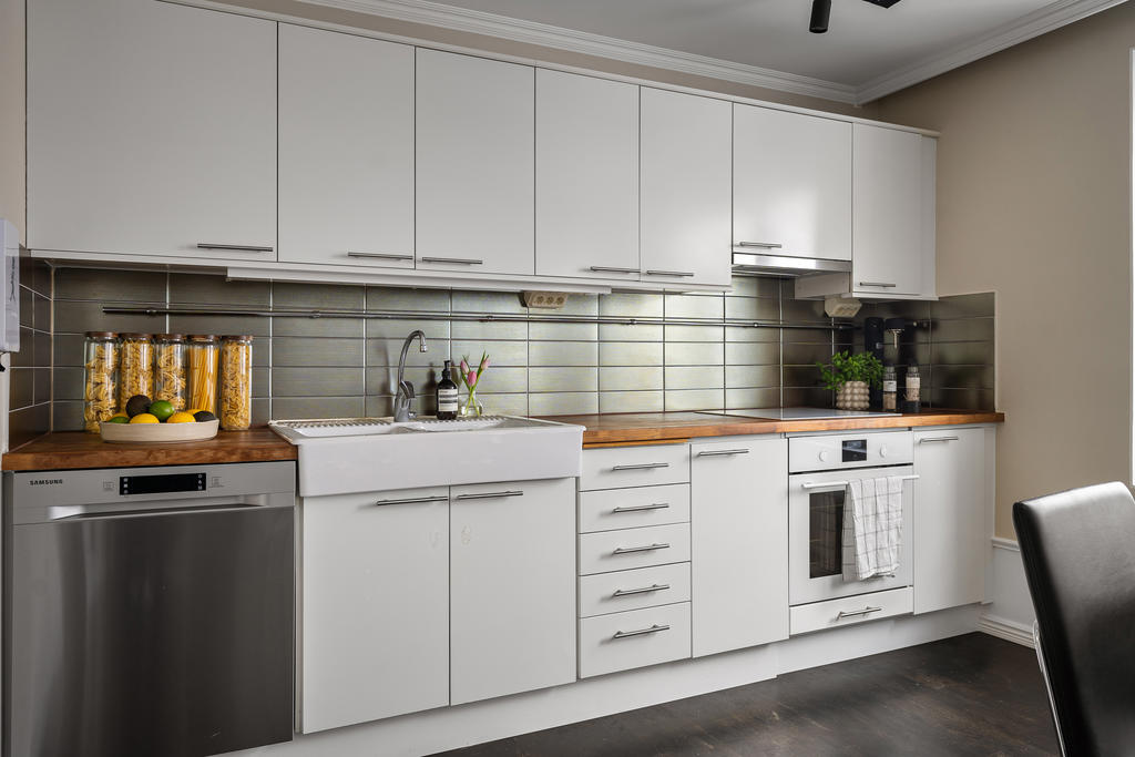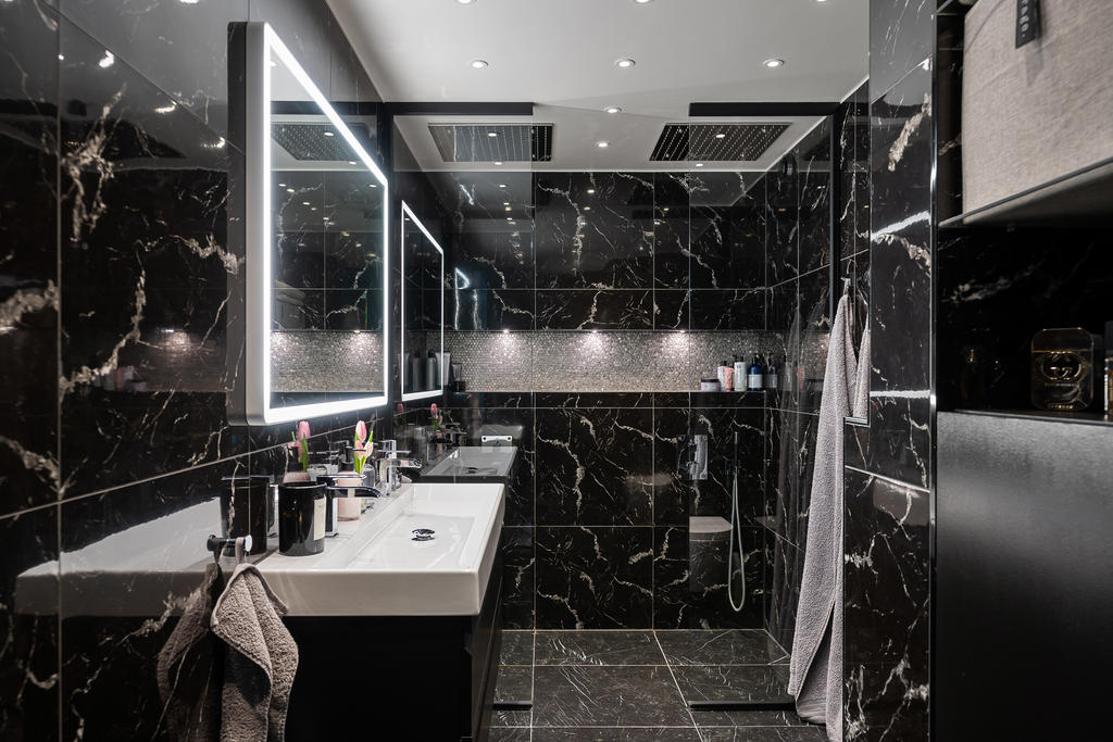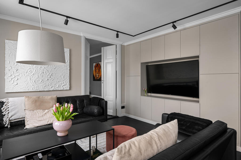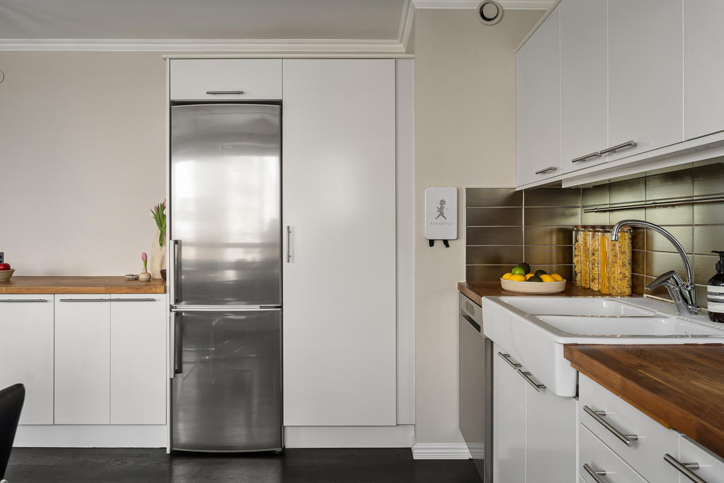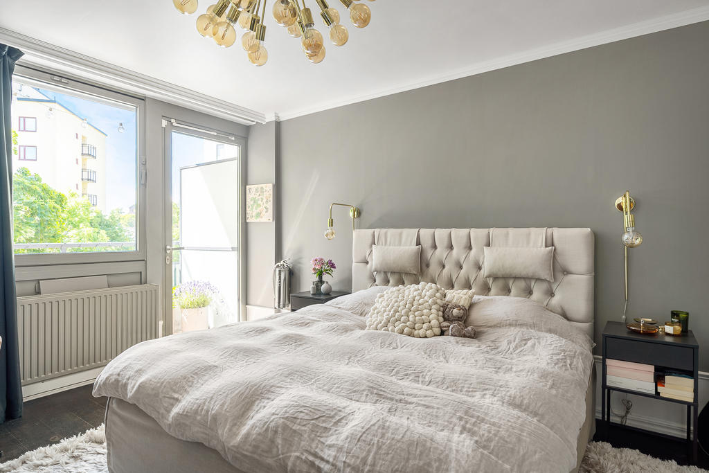 Redan i hallen möts du av generösa avhängningsmöjligheter i stilrena, platsbyggda garderober som skapar både ordning och ett elegant första intryck. Bostaden präglas genomgående av en välplanerad och integrerad belysning som lyfter fram materialvalen och skapar en varm, exklusiv atmosfär. Genomtänkta detaljer såsom strömbrytare och eluttag i matt svart från Buster + Punch bidrar till ett modernt och enhetligt uttryck. Bostaden öppnar upp sig mot ett luftigt och inbjudande sällskapsrum i öppen planlösning med köket. De stora fönsterpartierna i fil ger ett fantastiskt ljusinsläpp och förstärker känslan av rymd. Det moderna köket är fullt utrustat med diskmaskin, ugn, spis, fläkt, mikrovågsugn, kyl och frys samt en exklusiv vinkyl – perfekt för den som uppskattar det lilla extra. Här finns gott om plats för både en generös matplats och en bekväm soffgrupp, vilket gör bostaden idealisk för sociala tillställningar. Sovrummet är rymligt och rofyllt beläget mot en grönskande baksida. Här erbjuds en lyxig walk-in closet med heltäckningsmatta, automatiserad belysning och mycket goda förvaringsmöjligheter. Förvaring är genomgående väl tilltagen i hela bostaden, vilket gör det enkelt att hålla ett stilrent och organiserat hem. Från sovrummet nås även bostadens fantastiska balkong – en privat oas utan insyn där du kan njuta av lugna stunder med morgonkaffet eller ett glas vin i kvällssolen. Det exklusivt renoverade badrummet håller en mycket hög standard och är smakfullt utformat med dubbla integrerade takduschar, golvvärme och dubbla handfat. Här finns även en spegel med integrerad belysning, stilren kommod med god förvaring, vägghängd toalett samt praktiska inbyggda hyllor. Badrummet är dessutom utrustat med tvättmaskin och förberett utrymme för torktumlare – en perfekt kombination av funktion och lyx.