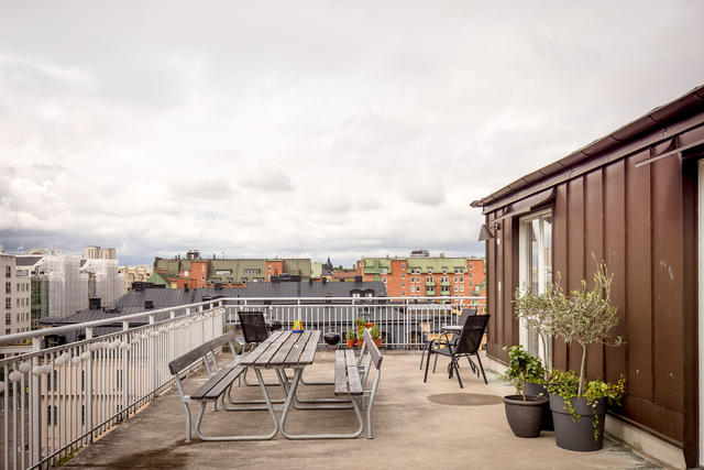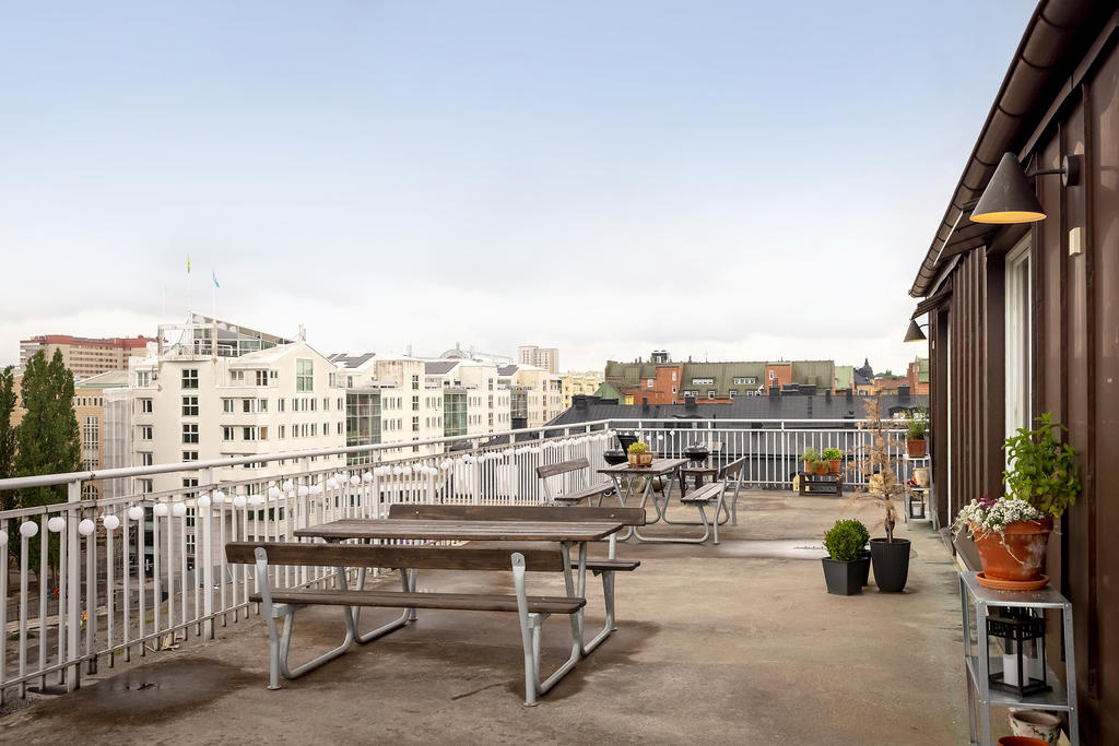 Föreningen erbjuder flera attraktiva gemensamma utrymmen, däribland en takterrass med utsikt över Fatbursparken – en uppskattad plats för avkoppling i en privat och trivsam miljö.