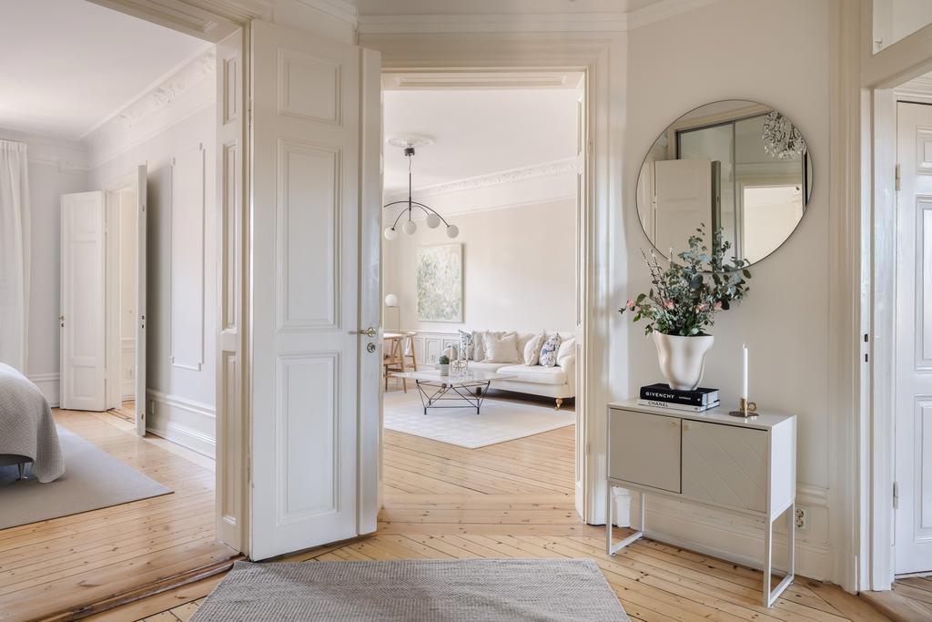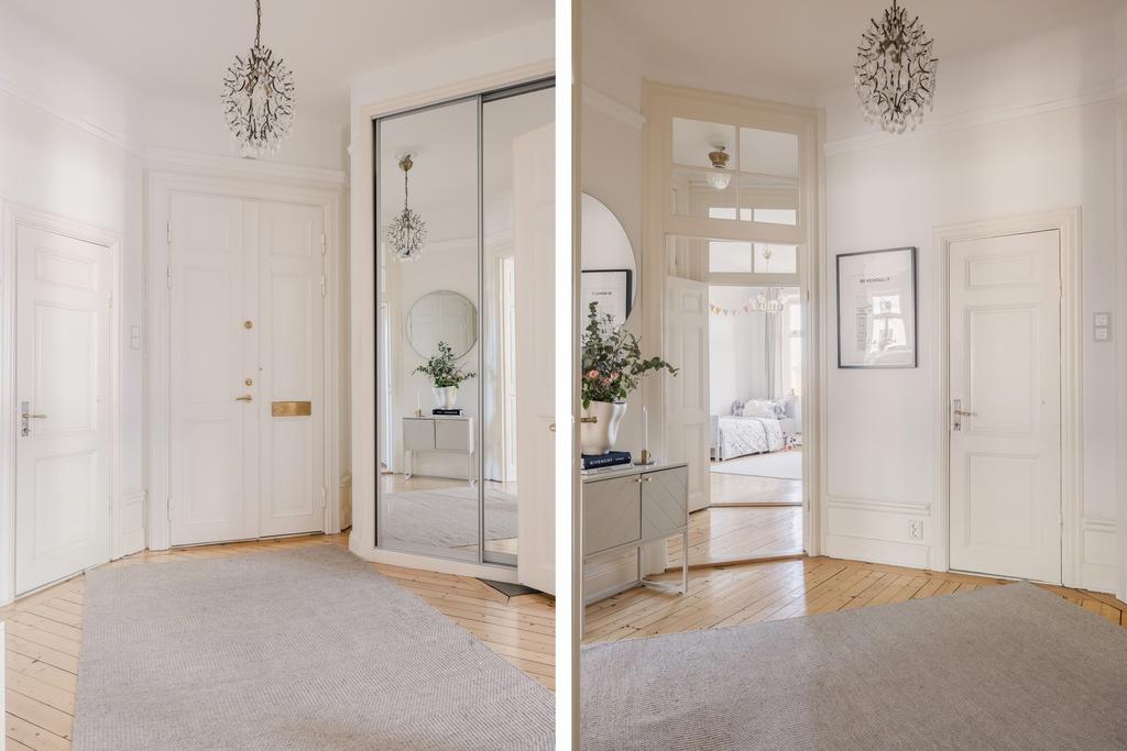 Den genomgående planlösningen skapar ett naturligt flöde mellan rummen, och det stilfulla originalgolvet binder samman helheten på ett enhetligt och exklusivt sätt. De generösa rumsvolymerna erbjuder gott om plats för både sociala tillställningar och avkoppling i en rofylld miljö. Balkongen blir en naturlig förlängning av bostaden – en perfekt plats för morgonkaffet i solen eller ljumma sommarkvällar med utsikt över parkens grönska. Här kombineras sekelskiftescharm med modern komfort, genom exklusiva materialval, noggrant utvalda kulörer och generösa förvaringsmöjligheter. Till lägenheten hör dessutom ett rymligt källarförråd.