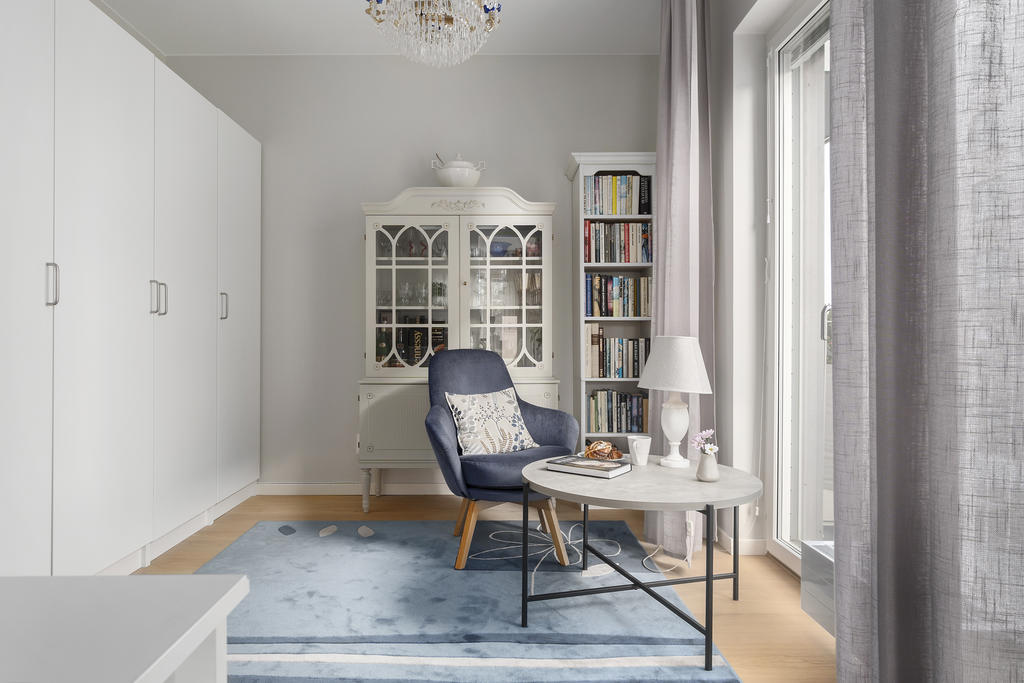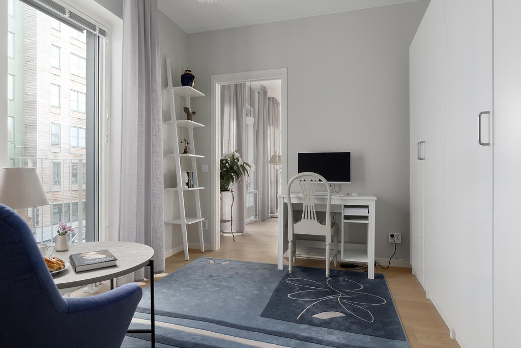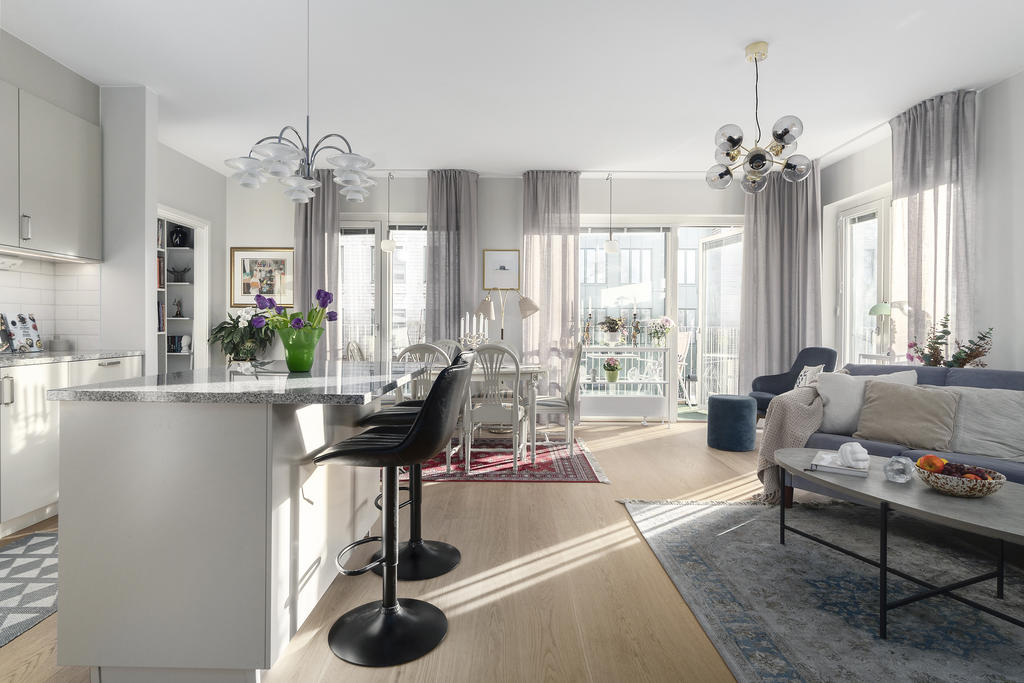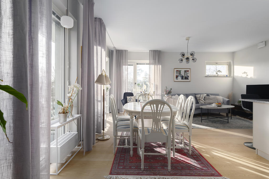 Det generösa sällskapsrummet är hemmets naturliga samlingspunkt. Ljuset flödar in genom stora fönsterpartier och möbleringen bjuder in till både vila och umgänge. De öppna ytorna och flera balkongutgångar skapar en atmosfär av frihet – en plats att leva, andas och trivas i.