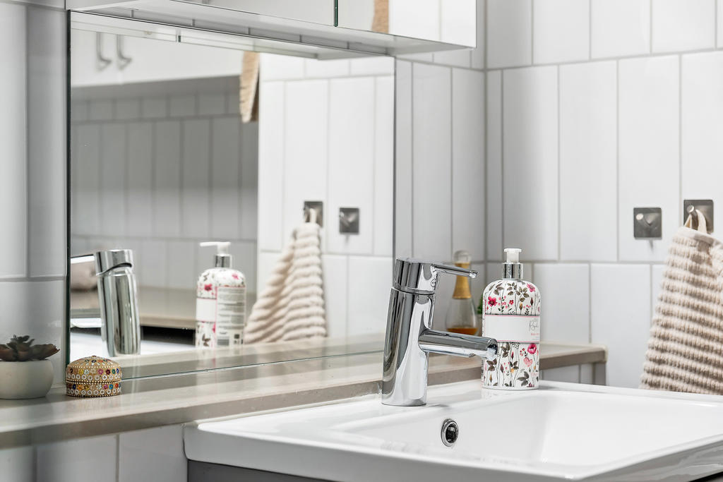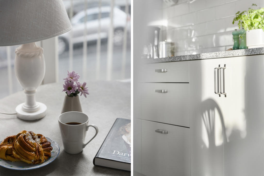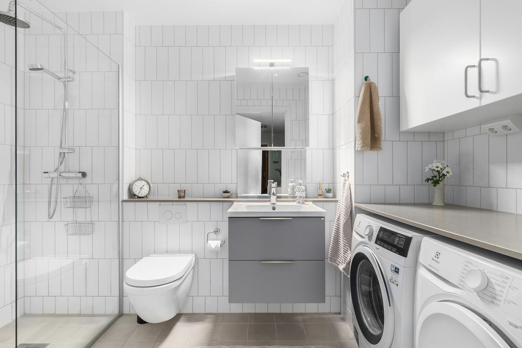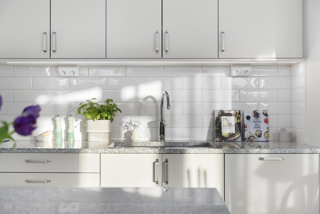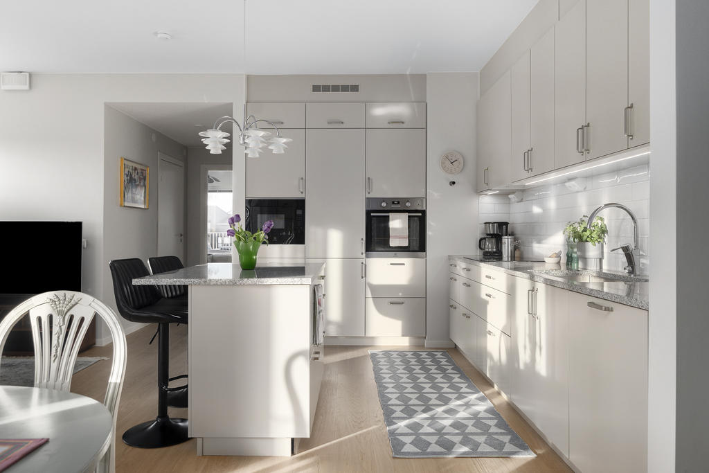 Det stilrena köket är både elegant och funktionellt, utrustat med moderna vitvaror, gott om arbetsytor och en inbjudande matplats för 4–6 personer. Här finns utrymme för både vardagens enkelhet och helgens långa middagar i gott sällskap.