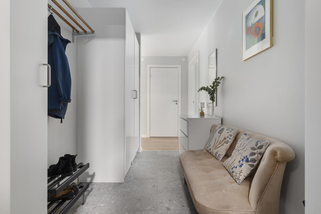 Hallen välkomnar med lugn och ordning – här finns gott om plats för kläder och skor, och en känsla av struktur redan när du kliver in.