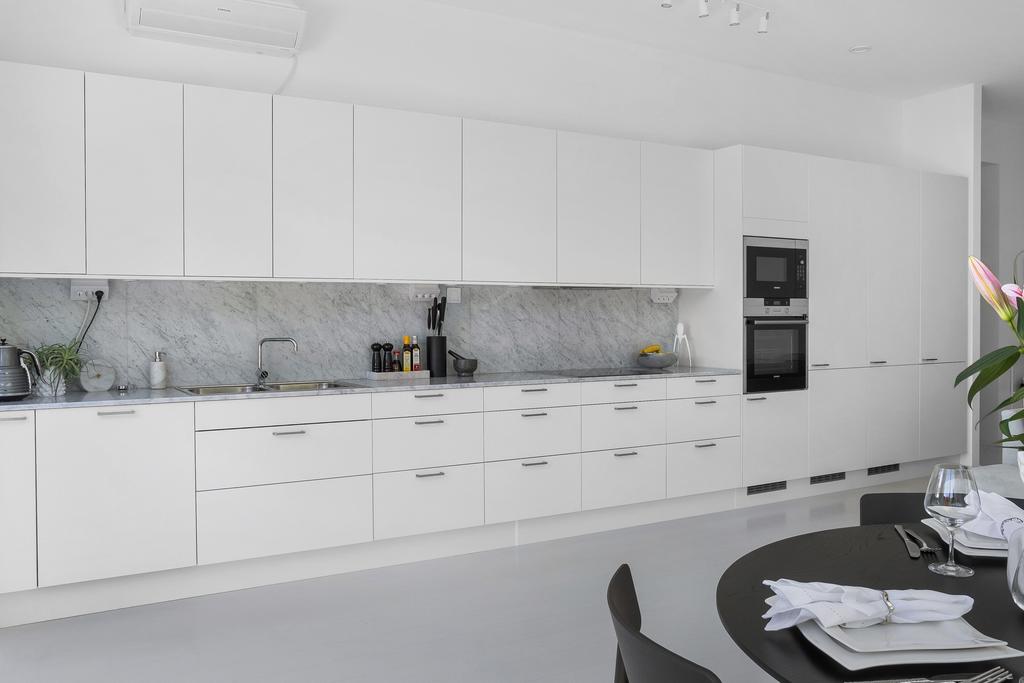 I bostaden så möts man av en generös takhöjd på 3 meter, det skapar en härlig rymd med behagligt ljus till denna toppmoderna bostad. Bra planerat med trivsamma sällskapsytor och en modernt öppen planlösning mellan kök och vardagsrum, till det en värmande braskamin att samlas runt när kvällen lägger sitt mörker. Med stora fönsterpartier som omsluter huset skapas ett fantastiskt ljusflöde med naturen inpå livet och enkel access till trädgården. Tre fina sovrum och allrum på övre plan. Vidare så finns det två moderna och rymliga badrum. Bostaden är byggd med hög standard och exklusiva materialval som marmor i både kök och badrum samt väggar målade i avslappnat ljusa kulörer.