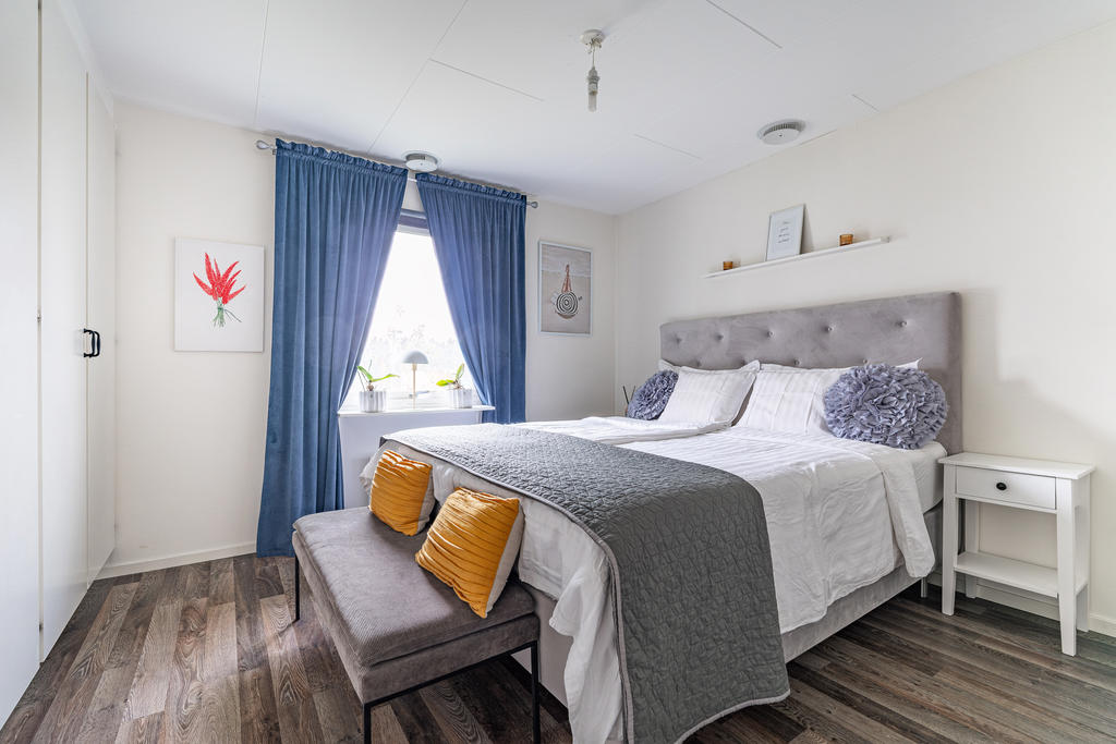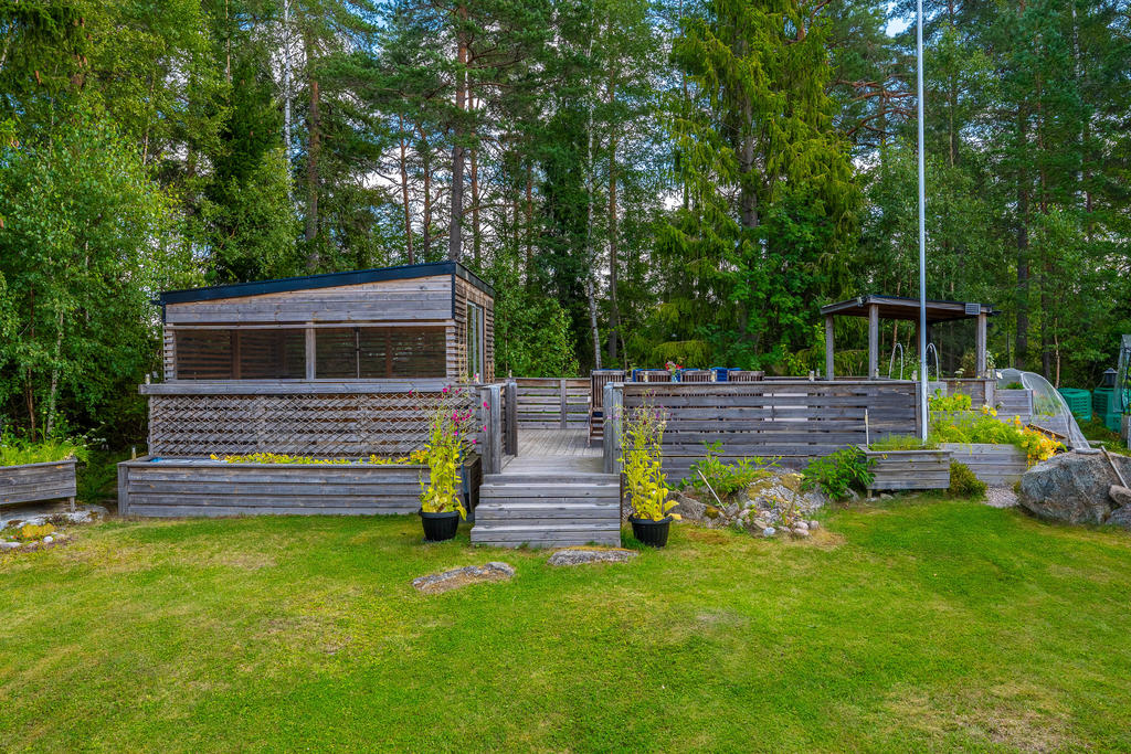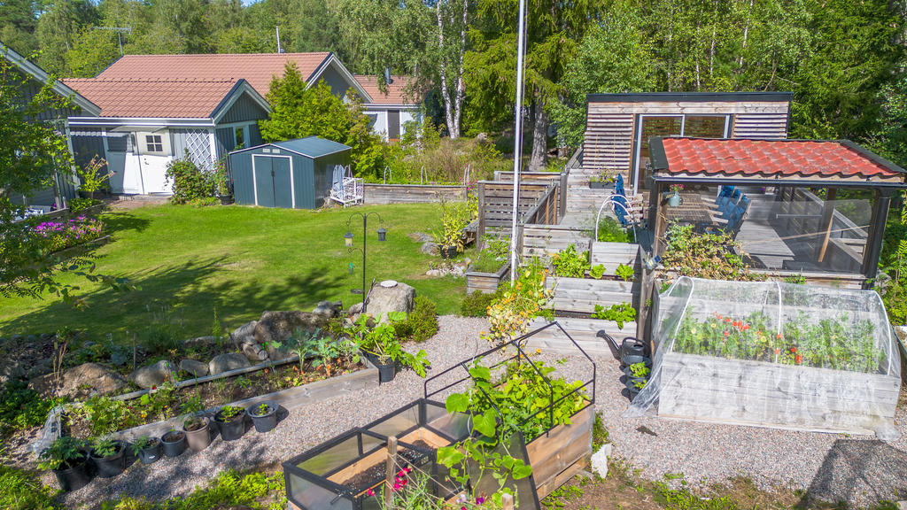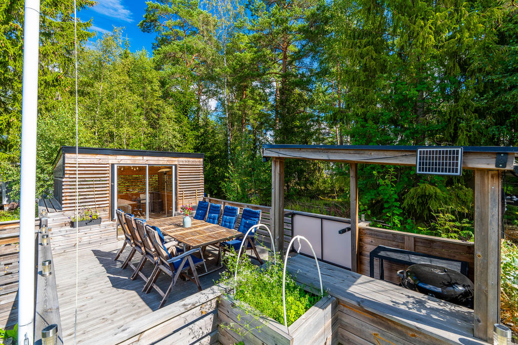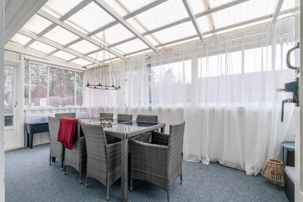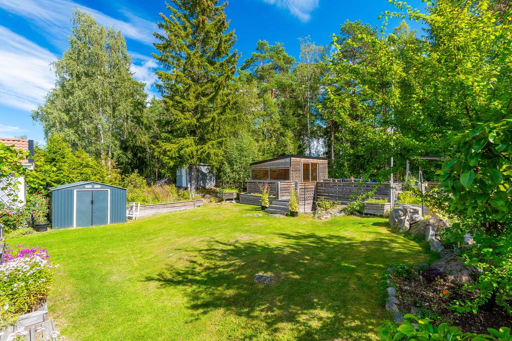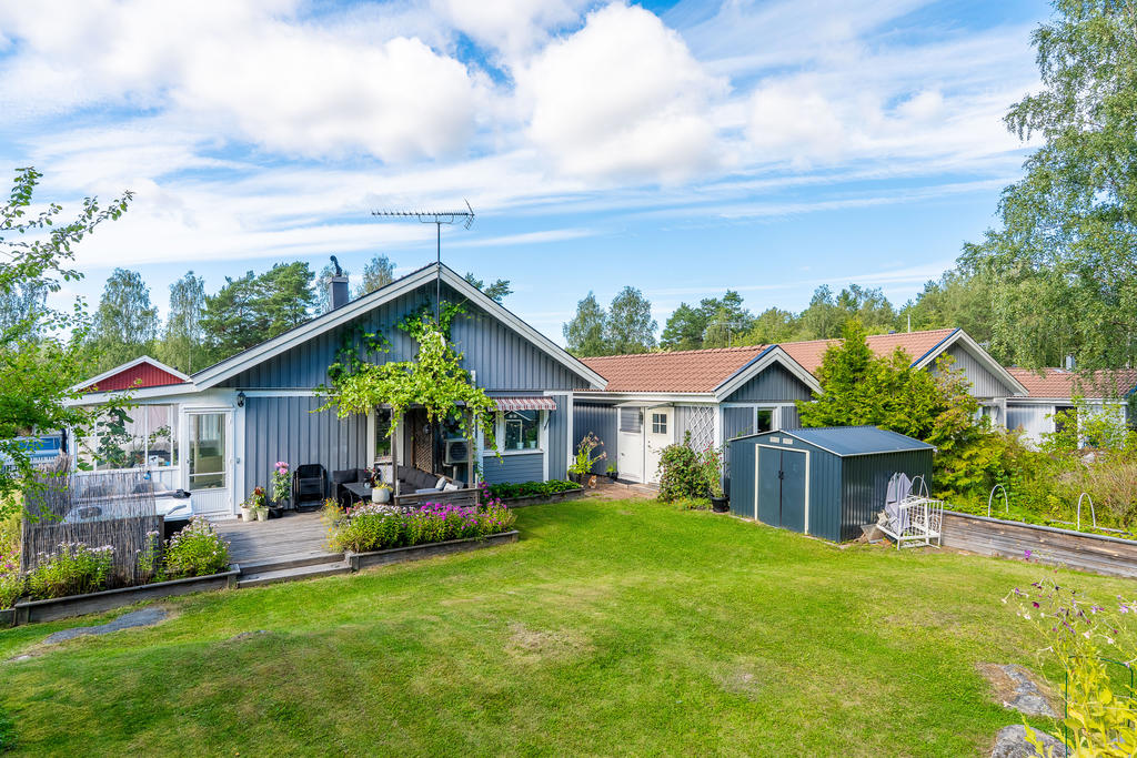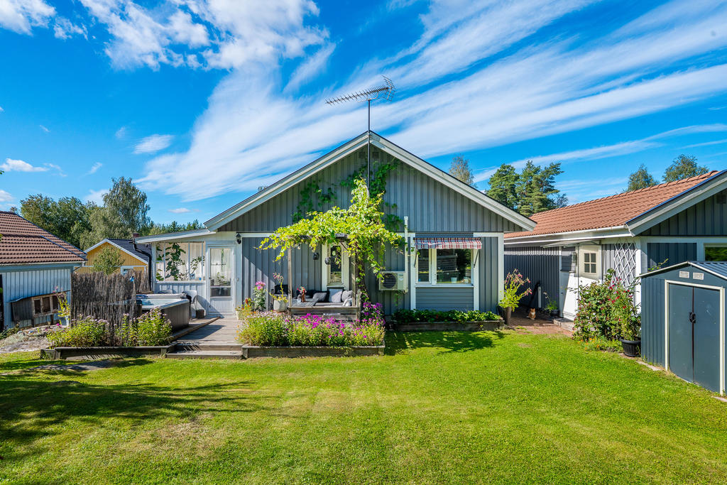 Charmig enplansvilla med två uteplatser och trädgårdsoas